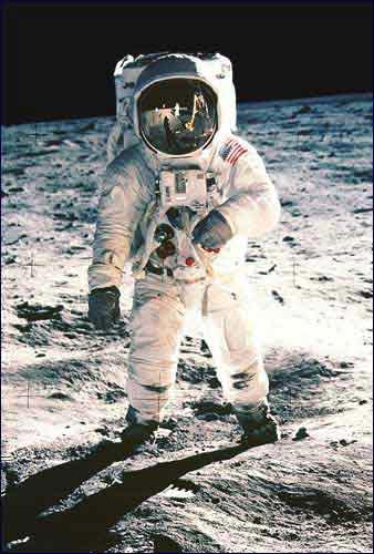 16 Ιουλίου 1969 Ο αρχηγός της αποστολής APOLLO 11 Neil Armstrong είναι αυτός που πρώτος πάτησε το πόδι του στη σελήνη και είπε και την ιστορική πια φράση "One small step for man, one giant leap for mankind", δηλαδή ένα μικρό βήμα για τον άνθρωπο, ένα τεράστιο για την ανθρωπότητα. Εδώ τραβάει μια αναμνηστική φωτογραφία τον συναδερφό του Aldrin και είναι η πρώτη φωτογραφία ανθρώπου στο φεγγάρι. Στο σκάφανδρο του Aldrin καθρεπτίζεται η σεληνάκατος. |