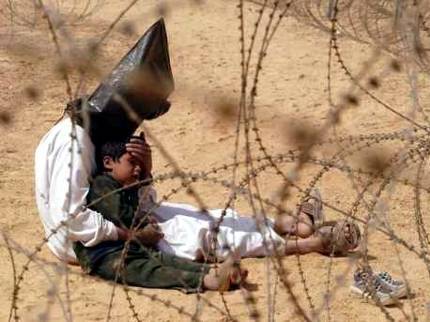31 Μαρτίου 2003 Ένας Ιρακινός κρατούμενος, προσπαθεί να ηρεμήσει το τρομοκρατημένο παιδί του, που βρίσκεται μαζί του στο στρατόπεδο αιχμαλώτων πολέμου στο An Najaf, στο Iraq. |