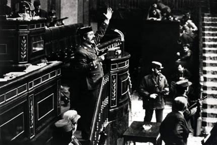 23 Φεβρουαρίου 1981 Ο συνταγματάρχης Antonio Tejero Molina και μέλη της Πολιτοφυλακής και της Στρατονομίας, κρατά ομήρους τα μέλη της ισπανικής βουλής στην Μαδρίτη. Με την απειλή όπλων, εκφωνεί λόγο στο ακροατήριο.