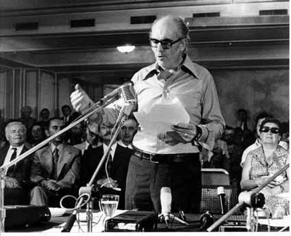 3 Σεπτεμβρίου 1974 Ο Ανδρέας Παπανδρέου ανακοινώνει την ίδρυση του ΠΑΣΟΚ διαβάζοντας την ομώνυμη διακήρυξη, στον ημιώροφο του ξενοδοχείου Κινγκ Τζορτζ. |