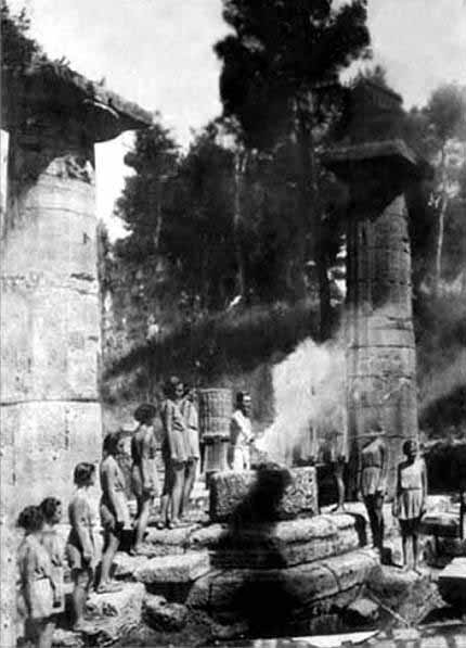 Αρχαία Ολυμπία 1936 Η πρώτη αφή της φλόγας των σύγχρονων Ολυμπιακών Αγώνων για τους Ολυμπιακούς του Βερολίνου. Την Ολυμπιακή δάδα ανάβει η πρωθιέρια Κούλα Πράτσικα. |