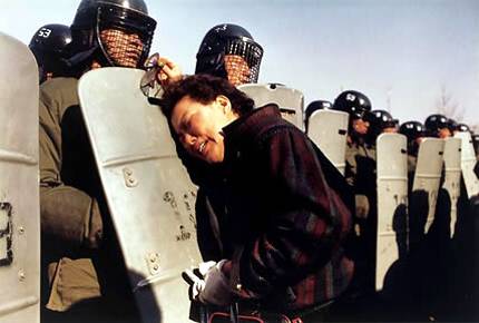 Νότιος Κορέα 1987 Μια μητέρα ικετεύει τις δυνάμεις ασφαλείας να συγχωρήσουν και να αφήσουν ελεύθερο τον γιο της, ο οποίος συνελήφθη, μετά από συμμετοχή σε πορεία διαμαρτυρίας για νοθεία στις γενικές εκλογές. |