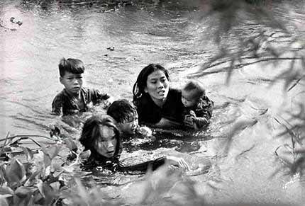 Νότιο Βιετνάμ 1965 Μια μητέρα με τα 3 παιδιά της, διασχίζει κολυμπώντας ένα ποτάμι για να ξεφύγει από τις αμερικανικές βόμβες. Η φωτογραφία ελήφθη απ' τον Ιάπωνα Kyoichi Sawada.