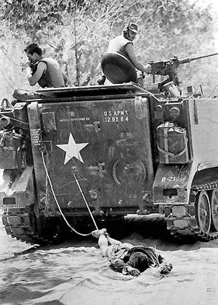 Νότιο Βιετνάμ 1966 Ένα τεθωρακισμένο των ΗΠΑ σέρνει έναν νεκρό Βιετκόνγκ.