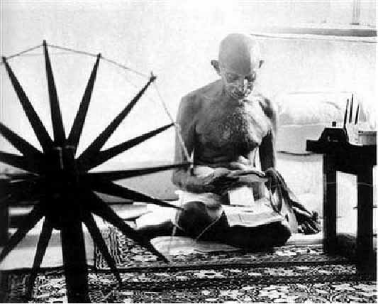 Ινδία 1946 Ο Μαχάτμα Γκάντι διαβάζει δίπλα στην ανέμη του. Ο Γκάντι επέτρεψε στην δημοσιογράφο Margaret Bourke-White να τον φωτογραφίσει, με την προϋπόθεση να μάθει να χειρίζεται την ανέμη.