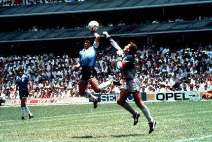 22 Ιουνίου 1986 Το πιο πολυσυζητημένο ίσως «ψεύτικο» γκολ στην ιστορία του ποδοσφαίρου. Στον κρίσιμο αγώνα Αργεντινής-Αγγλίας, στα πλαίσια του Παγκόσμιου Κυπέλλου ποδοσφαίρου που διεξάγεται στο Μεξικό, ο Ντιέγκο Μαραντόνα επιτυγχάνει γκολ χρησιμοποιώντας έξυπνα το χέρι του. Μετά τον αγώνα, ο Μαραντόνα δηλώνει ότι ήταν «το χέρι του Θεού» που έβαλε το γκολ. |