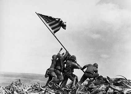 26 Μαρτίου 1945 Αμερικάνοι πεζοναύτες υψώνουν την σημαία τους σε ένα λόφο στο νησί Ιβοζίμα. Η φωτογραφία αυτή του Joe Rosenthal κέρδισε το βραβείο Πούλιτζερ και έγινε το σύμβολο της νίκης των Η.Π.Α στον 2ο παγκόσμιο πόλεμο. Η φωτογραφία και η στιγμή είναι αριστουργηματική ανεξάρτητα από το τι αναπαριστά. Παρόλο που όπως έχει παραδεχτεί και ο φωτογράφος δεν είναι το πρώτο στήσιμο της σημαίας στο νησί μετά την κατάληψή του, αλλά η αντικατάσταση της πρώτης σημαίας με μια μεγαλύτερη για να φαίνεται καλύτερα από τα στρατεύματα που μάχονταν στο νησί και προσπαθούσαν να εξουδετερώσουν και τις τελευταίες εστίες αντίστασης. |