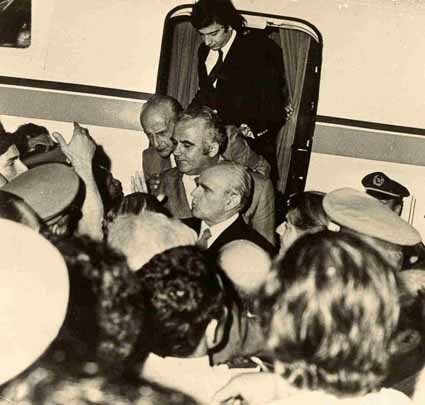 23 προς 24 Ιουλίου 1974 Ο Κωνσταντίνος Καραμανλής αποβιβάζεται από το αεροπλάνο της Γαλλικής προεδρίας που τον μετάφερε από το Παρίσι. Επάνοδος που σηματοδότησε την κατάλυση του δικτατορικού καθεστώτος και την αποκατάσταση του δημοκρατικού πολιτεύματος στη χώρα. Διακρίνονται επίσης πίσω του ο δημοσιογράφος Τάκης Λαμπρίας, στα δεξιά ο Κωνσταντίνος Χρυσοστάλης και στο βάθος ο Μιχάλης Λιάπης. |