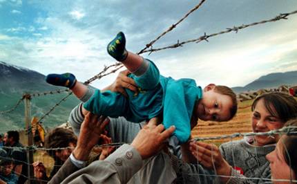 Αλβανία 1999 Σ' έναν προσφυγικό καταυλισμό Κοσοβάρων, ο 2χρονος Akim Shala περνιέται μέσα από το συρματόπλεγμα, για να καταλήξει στην αγκαλιά του παππού του. Η φωτογραφία ελήφθη από την Carol Guzy και τιμήθηκε με βραβείο Πούλιτζερ το 2000. |