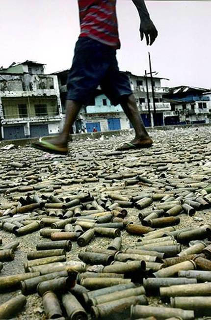 Μονρόβια 2003 Ένα παιδί περπατά πάνω σε έναν δρόμο γεμάτο από κάλυκες σφαιρών, που αφήνει πίσω του ο εμφύλιος στην Λιβερία. Η φωτογραφία ελήφθη από την Carolyn Cole και τιμήθηκε με βραβείο Πούλιτζερ το 2004. |