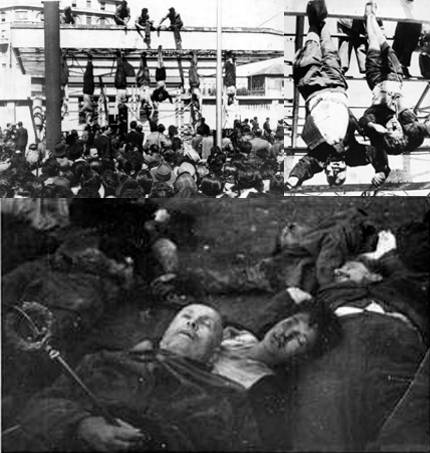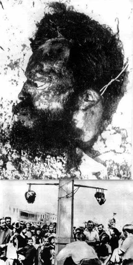 15 Ιουνίου 1945 Ο Άρης Βελουχιώτης παγιδευμένος από την Εθνοφυλακή αυτοκτονεί. Αποκεφαλίζεται και 3 ημέρες αργότερα το κεφάλι του, μαζί μ' αυτό του συντρόφου του Τζαβέλα, βρίσκονται στα Τρίκαλα όπου και κρέμονται σε έναν φανοστάτη της κεντρικής πλατείας σε δημόσια θέα για 2 ημέρες. |