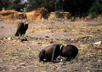 Μάρτιος 1993 Ο φωτογράφος Kevin Carter, σε ταξίδι του στο Σουδάν, βρίσκεται τυχαία μπροστά σε μια ανατριχιαστική σκηνή. Ένα όρνεο παραμονεύει πίσω από ένα εξαντλημένο κοριτσάκι, περιμένοντας την τη στιγμή που θα πεθάνει. Ο Carter περιμένει για 20', μήπως το όρνεο ανοίξει τα φτερά του, κάνοντας έτσι τη φωτογραφία πιο εντυπωσιακή. Τελικά απογοητεύεται και «συμβιβάζεται» με την φωτογραφία αυτή, που του έδωσε και το βραβείο Πούλιτζερ. Ο Carter, που αυτοκτόνησε λίγους μήνες αργότερα, κατηγορήθηκε για απάνθρωπη συμπεριφορά, καθώς συν τοις άλλοις, μετά τη φωτογράφηση, αφού έδιωξε το όρνεο, έφυγε χωρίς να βοηθήσει το κοριτσάκι, το οποίο τελικά διεσώθη από παρέμβαση άλλων. |