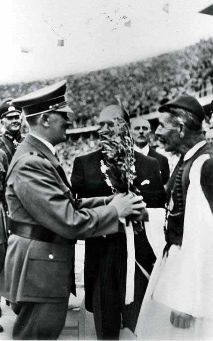 Βερολίνο 1936 Ο Χίτλερ βραβεύει τον Σπύρο Λούη, ο οποίος παρέλασε με φουστανέλα, ως επίτιμο μέλος της ελληνικής αποστολής στους Ολυμπιακούς Αγώνες του Βερολίνου στη Γερμανία. |