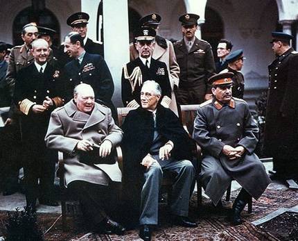 4 Φεβρουαρίου 1945 Η διάσκεψη της Γιάλτας. Οι 3 Μεγάλοι, Winston Churchill, Franklin D. Roosevelt και Joseph Stalin, καθορίζουν τις ζώνες επιρροής τους, ως νικητές του Β' Παγκοσμίου Πολέμου.
