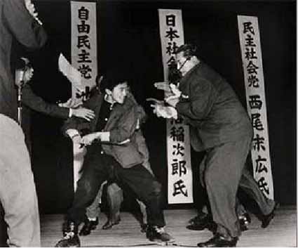 12 Οκτωβρίου 1960 Ο 17χρονος ακροδεξιός μαθητής, Otoya Yamaguchi , σκοτώνει με ένα ξίφος τον σοσιαλιστή πολιτικό, Inejiro Asanuma, κατά την διάρκεια ομιλίας του στο Τόκιο. Ο φωτογράφος Yasushi Nagao που αποτύπωσε τη σκηνή, δηλώνει αργότερα ότι απλά βρέθηκε στο σωστό σημείο τη σωστή στιγμή. |