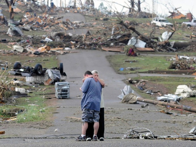 Η μητÝρα αγκαλßζει το γιο της με φüντο τα ερεßπια που Üφησε πßσω του τυφþνας που Ýπληξε την πολιτεßα της Alabama τον Απρßλιο του 2011.