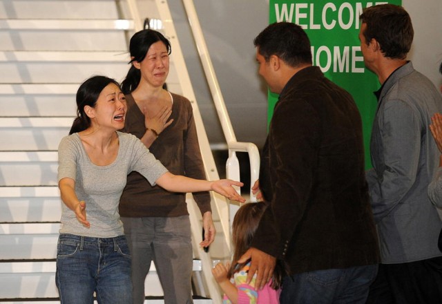 Μια ακüμη φωτογραφßα που συνδÝεται με την κατÜσταση στην κορεατικÞ χερσüνησο και απεικονßζει τη στιγμÞ που δýο δημοσιογρÜφοι, που εßχαν συλληφθεß και καταδικαστεß για 12 χρüνια καταναγκαστικÞς εργασßας στη Β. ΚορÝα, ξαναβρßσκουν τις οικογÝνειÝς τους στις ΗΠΑ, Ýπειτα απü διπλωματικÞ παρÝμβαση.