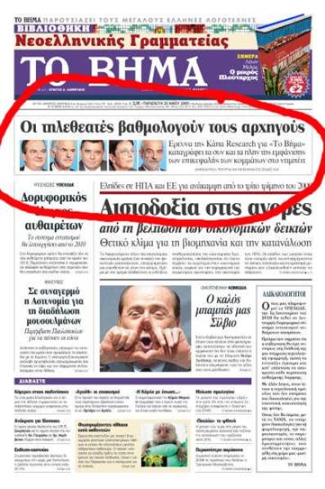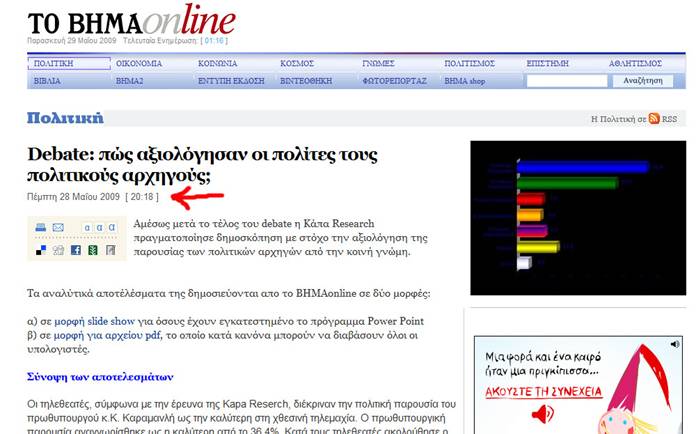 Είναι προφανές ότι το γκάλοπ μαϊμού του Βήματος, στήθηκε για να δημιουργήσει εντυπώσεις. Στην ηλεκτρονική ανάρτηση του γκάλοπ, η ώρα που δημοσιεύθηκε η δημοσκόπηση είναι 20.18. Το debate άρχισε στις 20.10. Παρατηρώντας προσεκτικά σήμερα και πάλι το debate, μέχρι τις 20.18 είχαν ερωτηθεί και απαντήσει μόνο οι Κώστας Καραμανλής και Γ. Παπανδρέου, γιατί αφαιρώντας τα εισαγωγικά της Χούκλη, οι ερωτήσεις ξεκίνησαν στις 20.14. Απίθανα πράγματα με την Πρετεντεροφυλλάδα. Έφτιαξαν και δημοσίευσαν δημοσκόπηση χωρίς να έχουν ερωτηθεί και απαντήσει όλοι οι πολιτικοί αρχηγοί. Μπράβο παιδιά και εις ανώτερα!