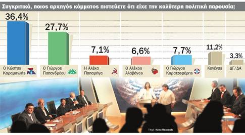 Στο ερώτημα «ποιος πρόεδρος κόμματος πιστεύετε ότι είχε την καλύτερη πολιτική παρουσία»: Το 36,4% των ερωτηθέντων αξιολογεί ότι την καλύτερη πολιτική παρουσία είχε ο πρωθυπουργός Κ. Καραμανλής. Ακολουθεί ο πρόεδρος του ΠΑΣΟΚ Γ. Παπανδρέου που «έπεισε» το 27,7% του δείγματος. Το 11,2% των συμμετεχόντων στην δημοσκόπηση κρίνουν ότι την παράσταση έκλεψε ο ..«Κανένας».