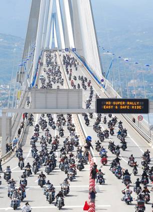 την γέφυρα Ρίου - Αντιρρίου, αποτελούν την μεγαλύτερη παρέλαση μοτοσικλετών Harley στην ιστορία (το προηγούμενο ρεκόρ ήταν 2.118 μοτοσικλέτες, στο Ντένβερ των ΗΠ, τον Δεκέμβριο του 2002)! Έτσι, η ζεύξη Ρίου - Αντιρρίου, η Πάτρα και το «super rally 2010» περνούν στην ιστορία και με έναν άλλο τρόπο... Να σημειωθεί πως πολυάριθμοι επισκέπτες συνέρευσαν στην γέφυρα, παρακολουθώντας από κοντά το μοναδικό εγχείρημα, που για τους ανθρώπους της γέφυρας, αλλά και για όσους εργάστηκαν για αυτό, αποτέλεσε και ένα ακόμα «στοίχημα»: Της μαζικότερης ασφαλούς διέλευσης μοτοσικλετών, που επίσης κερδήθηκε χάρη στις προσπάθειες των οργανωτών, της «ΓΕΦΥΡΑ ΑΕ» και της Τροχαίας.