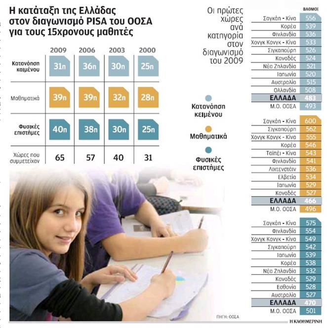 Βελτιώνουν τις επιδόσεις τους οι Έλληνες μαθητές στον διαγωνισμό PISA του Οργανισμού Οικονομικής Συνεργασίας και Ανάπτυξης (ΟΟΣΑ) για την κατανόηση κειμένου, τις φυσικές επιστήμες και τα μαθηματικά. Ο διαγωνισμός γίνεται κάθε τρία χρόνια, συμμετέχουν 15χρονοι από μέλη και μη μέλη του οργανισμού, και χθες ο ΟΟΣΑ ανακοίνωσε τα αποτελέσματα για το 2009. Η Ελλάδα, παρότι βρίσκεται στην ομάδα των χωρών κάτω από τον μέσο όρο του ΟΟΣΑ, έχει βελτιώσει τις επιδόσεις της, για πρώτη φορά στους τέσσερις τελευταίους διαγωνισμούς. Αυτό που εντυπωσιάζει, πάντως, είναι οι επιδόσεις των μαθητών από την Κίνα, η οποία εκπροσωπήθηκε από μαθητές των τεσσάρων πλούσιων περιοχών -Σαγκάη, Χονγκ Κονγκ, Ταϊπέι και Μακάο- των ανατολικών της ακτών. Ειδικά οι μαθητές από τη Σαγκάη... έσκισαν, καθώς συμμετείχαν για πρώτη φορά στον διαγωνισμό και πήραν την πρώτη θέση και στις τρεις κατηγορίες του. Οι επιδόσεις των Ελλήνων μαθητών κατέταξαν τη χώρα μας σε σύνολο 65 χωρών: • Στα μαθηματικά διατηρήσαμε την ίδια θέση (39η) με τον διαγωνισμό του 2006, αλλά η ελληνική επίδοση βελτιώθηκε φθάνοντας τους 466 βαθμούς από 459 β. το 2006 και 445 β. το 2003. Παρότι είναι κάτω από τον μ.ό. του ΟΟΣΑ, στους 496 β., η Ελλάδα είχε τη μεγαλύτερη βελτίωση όπως και οι Μεξικό, Τουρκία, Πορτογαλία, Ιταλία και Γερμανία. Στην ίδια βαθμολογική ομάδα με τη χώρα μας είναι η Ρωσία, η Κροατία, η Λιθουανία. • Στην κατανόηση κειμένου, η Ελλάδα ανέβηκε στην 31η θέση με 483 βαθμούς, ισοβαθμώντας με τη Σλοβενία. Το 2006 ήταν στην 36η θέση με 460 βαθμούς, ενώ το 2003 ήταν στην 30ή θέση με 472 βαθμούς. Στην ίδια βαθμολογική κλίμακα βρίσκονται η Ιταλία, η Ισπανία, η Τσεχία, η Σλοβακία. Τη μεγαλύτερη βελτίωση είχαν οι Χιλή, Ισραήλ, Πολωνία, Πορτογαλία, Κορέα, Ουγγαρία και Γερμανία. • Οι φυσικές επιστήμες είναι το μόνο πεδίο που οι Ελληνες είχαν χειρότερα αποτελέσματα σε σχέση με το 2006. Η Ελλάδα το 2009 κατέλαβε τη 40ή θέση με 470 βαθμούς, ενώ το 2006 ήταν 38η με 473 β. Το 2003 ήταν 30ή με 481 β. Στην ίδια βαθμολογική κλίμακα με τη χώρα μας βρίσκονται η Ρωσία, το Λουξεμβούργο, η Αυστρία. Τη μεγαλύτερη βελτίωση είχαν οι Τουρκία, Πορτογαλία, Κορέα, Ιταλία, Νορβηγία, ΗΠΑ και Πολωνία. Στην έρευνα συμμετείχαν 4.969 μαθητές από 184 σχολεία της Ελλάδας Το πρόγραμμα PISA μετράει τις γνώσεις των 15χρονων και αξιολογεί την αποτελεσματικότητα του εκπαιδευτικού συστήματος κάθε χώρας, ως προς το κατά πόσο οι μαθητές εφαρμόζουν τις γνώσεις που έχουν αποκτήσει στο σχολείο για την επίλυση προβλημάτων της καθημερινής ζωής. Κάθε τριετία δίνει βάρος σε διαφορετικό πεδίο και το 2009 δόθηκε στην κατανόηση κειμένου. Συγκρίνοντας τις επιδόσεις των Ελλήνων το 2009 με τις προηγούμενες χρονιές με κριτήριο το πεδίο, που δόθηκε κάθε φορά βάρος, προκύπτει: Στα μαθηματικά βελτιώθηκαν κατά 21 μονάδες από τον διαγωνισμό του 2003, τελευταία χρονιά που δόθηκε βάρος στο συγκεκριμένο πεδίο. Στην κατανόηση κειμένου βελτιώθηκαν κατά 9 μονάδες από το 2000, όταν ο διαγωνισμός επικεντρώθηκε στην κατανόηση κειμένου. Στις φυσικές επιστήμες έχασαν 3 μονάδες από τον βαρύνοντα για το πεδίο διαγωνισμό του 2006. «Οι επιδόσεις κάθε χώρας σχετίζονται με τα αναλυτικά προγράμματα και τη δομή του σχολικού συστήματος», ανέφερε χθες στην «Κ» η εθνική διαχειρίστρια στο πρόγραμμα PISA και καθηγήτρια Εκπαιδευτικής Ερευνας στο Ελληνικό Ανοιχτό Πανεπιστήμιο κ. Βάσω Χατζηνικήτα. «Θα προχωρήσουμε σε ριζικές αλλαγές στα προγράμματα σπουδών στην