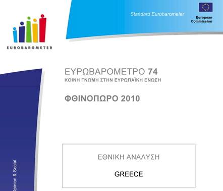 Σýμφωνα με την Ýρευνα, που διενεργÞθηκε τον ΝοÝμβριο, οι Ýλληνες εμφανßζουν υψηλÜ ποσοστÜ απαισιοδοξßας, αρνητικÞς προδιÜθεσης και χαμηλÞς αξιοπιστßας, ενþ αρνητικÞ εßναι και η στÜση τους απÝναντι στην ΕΕ, ακολουθþντας του Βρετανοýς, που εßναι πρþτη στη σχετικÞ κατηγορßα. Ωστüσο, οι Ýλληνες χαρακτηρßζουν την ΕΕ ως Ýναν οργανισμü που προσφÝρει ασφÜλεια. Οι 1.000 ερωτηθÝντες υποστÞριξαν üτι εμπιστεýονται περισσüτερο την ΕΕ απü ü,τι την κυβÝρνηση σχετικÜ με τη λÞψη αποφÜσεων για το μÝλλον τους. Ειδικüτερα, ως η περισσüτεροι ικανÞ για αυτüν τον σκοπü εμφανßζεται η ΕΕ, δεýτερη επιλογÞ στον σχετικü πßνακα εßναι ο «κανÝνας» και τρßτη εßναι η ελληνικÞ κυβÝρνηση. ΕπιπλÝον, το 93% ζητÜ απü την ΕΕ να θεσπßσει αυστηρüτερους κανüνες για τη φοροδιαφυγÞ και τους φορολογικοýς παραδεßσους. ΕπιπλÝον, 93% ζητÜ την εισαγωγÞ φüρων στα κÝρδη των επιχειρÞσεων, το 92% διαφÜνεια στις χρηματοπιστωτικÝς αγορÝς, το 90% περιορισμοýς στα bonus των τραπεζικþν στελεχþν, και το 70% την εισαγωγÞ φüρου στις χρηματοπιστωτικÝς συναλλαγÝς. ΠαρÜλληλα, οι Ýλληνες εßναι οι πλÝον δυσαρεστημÝνοι πολßτες της ΕΕ σχετικÜ με την οικονομικÞ κατÜσταση, την προσωπικÞ τους επαγγελματικÞ κατÜσταση, αλλÜ και για τις προοπτικÝς του 2011. ΚατÜ την παρουσßαση του ευρωβαρüμετρου οι εκπρüσωποι της ΕΕ σημεßωσαν üτι «η κατÜσταση Ýχει χειροτερÝψει σε σχÝση με πριν απü Ýξι μÞνες», ενþ την αρνητικÞ στÜση που Ýχουν οι ¸λληνες απÝναντι στα κοινοτικÜ üργανα, αποδßδουν ευθýνες στους ελληνικοýς φορεßς που δεν Ýχουν ενημερþσει σωστÜ, προσθÝτοντας πως «η ΕΕ Ýσωσε την ΕλλÜδα απü την πτþχευση, και αυτü δεν Ýχει γßνει αντιληπτü». ΕπιπλÝον, οι Ýλληνες επιθυμοýν η εθνικÞ κυβÝρνηση να αποφασßζει για θÝματα φορολογßας, συντÜξεων, συγκοινωνιþν, παιδεßας, υγεßας, γεωργßας και αλιεßας, ενþ θÝλουμε να αποφασßζει η κυβÝρνησÞ μας απü κοινοý με την ΕΕ σε θÝματα Ýρευνας, τρομοκρατßας, περιβÜλλοντος, ενÝργειας, περιφερειακÞς συνοχÞς κ.α. ΤÝλος, σχετικÜ με τη δυσπιστßα των EλλÞνων προς τους θεσμοýς και τα μÝσα ενημÝρωσης, αυτÞ καταγρÜφεται κατÜ σειρÜ: για τα πολιτικÜ κüμματα (93%), τις μεγÜλες επιχειρÞσεις (79%), την τηλεüραση (78%), την εθνικÞ κυβÝρνηση (76%), τον ΟΗΕ (74%), την εθνικÞ ΒουλÞ (73%), τον Τýπο (71%), τα εργατικÜ σωματεßα (65%), το ραδιüφωνο (61%), την ΕΕ (60%), τα εκκλησιαστικÜ ιδρýματα (58%), τη δικαιοσýνη (56%) και το Διαδßκτυο (41%). ΑναλυτικÜ η Ýρευνα του Ευροβαρüμετρου ΕΔΩ