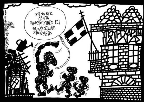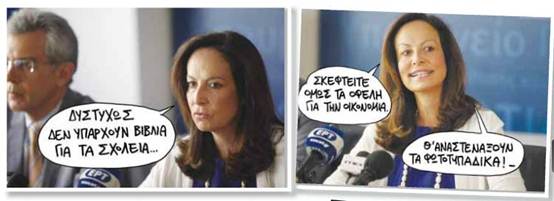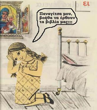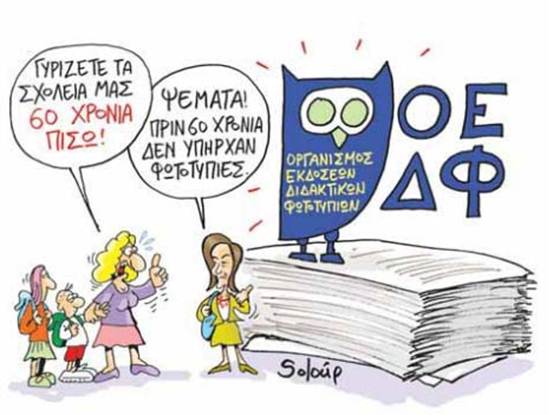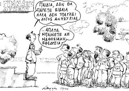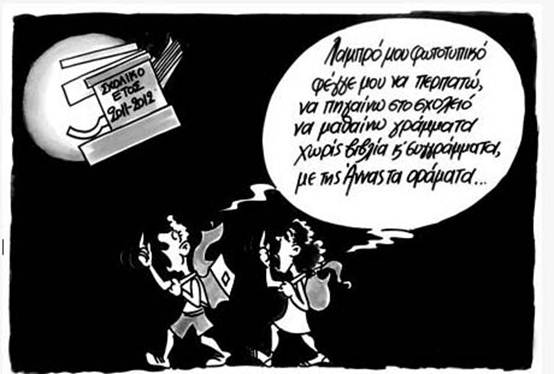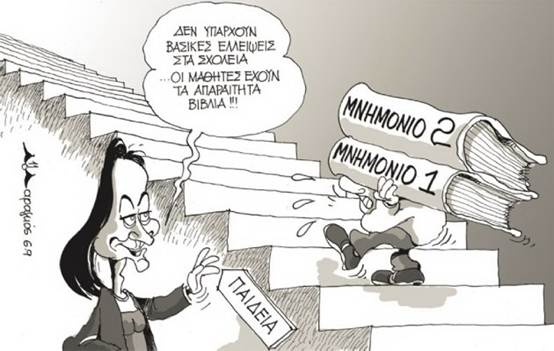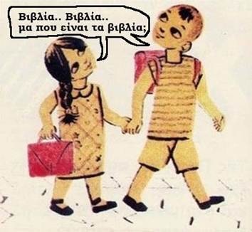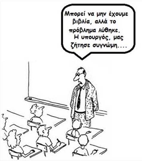 Το πρþτο κουδοýνι της νÝας σχολικÞς χρονιÜς χτυπÜει για περßπου 1.300.000 μαθητÝς πρωτοβÜθμιας και δευτεροβÜθμιας εκπαßδευσης και για περßπου 180.000 εκπαιδευτικοýς. ΦÝτος, η χρονιÜ ξεκινÜει με διÜφορα προβλÞματα, üπως η Ýλλειψη των βιβλßων, οι ελλεßψεις εκπαιδευτικþν (κυρßως ειδικοτÞτων), η Ýλλειψη κονδυλßων για τη λειτουργßα των σχολικþν επιτροπþν, οι περικοπÝς στους μισθοýς των εκπαιδευτικþν, οι ελλεßψεις στην υλικοτεχνικÞς υποδομÞς κ.λ.π. Για το σýνολο των οξυμÝνων αυτþν προβλημÜτων το Υπουργεßο δια στüματος της αρμüδιας Υπουργοý κας Διαμαντοποýλος λÝει: "Το Υπουργεßο Παιδεßας με τις κεντρικÝς και περιφερειακÝς διευθýνσεις του και σε συνεργασßα με üλους τους φορεßς θα εßναι διαρκþς στο πλÜι κÜθε σχολικÞς κοινüτητας, προκειμÝνου να επιτýχει τους στüχους της". Και βεβαßως για να αμβλυνθοýν τα οξυμÝνα προβλÞματα που Ýχουν φÝτος ανακýψει, το υπουργεßο Παιδεßας Ýχει δþσει οδηγßες στα σχολεßα, þστε να αντιμετωπιστοýν τα προβλÞματα και κυρßως η Ýλλειψη των βιβλßων, τα οποßα σε πρþτη φÜση θα αντικατασταθοýν απü dvd. Σε τοýτο το γκρßζο τοπßο, σας καλοýμε να απαντÞσουμε με χιοýμορ. ¸χουμε χÜσει πολλÜ, ας μη χÜσουμε και το χιοýμορ μας. Για το λüγο αυτü συλλÝξαμε μερικÝς γελοιογραφßες και σκßτσα που αφοροýν στην Ýλλειψη των βιβλßων και τα δημοσιεýουμε.