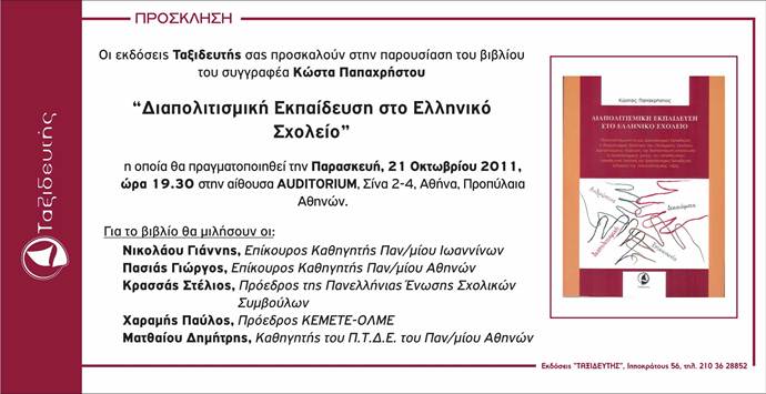 Το τρίτο του βιβλίο κυκλοφόρησε ο συνάδελφος Σχολικός Σύμβουλος και Διευθυντής σπουδών του Υπ. Π.Δ.Β.Μ.Θ Κώστας Παπαχρήστος με τίτλο: ΔΙΑΠΟΛΙΤΙΣΜΙΚΗ ΕΚΠΑΙΔΕΥΣΗ ΣΤΟ ΕΛΛΗΝΙΚΟ ΣΧΟΛΕΙΟ, από τις εκδόσεις Ταξιδευτής.