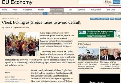 Στο ρεπορτÜζ του ΔημÞτρη ΚοντογιÜννη, των Financial Times, αναφÝρεται μεταξý Üλλων, üτι σε βÜρος του κυβερνητικοý συνασπισμοý στην ΕλλÜδα διατυπþνονται επικρßσεις üτι υπÞρξε λιγüτερο παραγωγικüς απü üσο Þλπιζαν κÜποιοι και παρατßθεται δÞλωση τραπεζßτη (που ζÞτησε να παραμεßνει ανþνυμος), ο οποßος τονßζει üτι Ýχουν περÜσει πÜνω απü 6 εβδομÜδες απü τη δημιουργßα της κυβÝρνησης, η οποßα Ýχει üμως ελÜχιστα να επιδεßξει. «ΣÝβομαι τον ΠαπαδÞμο, εßμαι üμως απογοητευμÝνος γιατß περßμενα περισσüτερα», καταλÞγει. Στο ßδιο πλαßσιο παρατßθεται επßσης, δÞλωση «στενοý συμβοýλου του πρωθυπουργοý», ο οποßος παραδÝχεται üτι θα μποροýσαν - στο διÜστημα που Ýχει αναλÜβει ο κυβερνητικüς συνασπισμüς - να Ýχουν γßνει περισσüτερα πρÜγματα, υπογραμμßζει ωστüσο üτι οι συνεννοÞσεις μεταξý των κομμÜτων που συμμετÝχουν στον κυβερνητικü συνασπισμü παßρνουν περισσüτερο χρüνο και προσθÝτει üτι η κυβÝρνηση εßναι αποφασισμÝνη να επιλýσει üλα τα θÝματα που εκκρεμοýν. Στην εν λüγω ανταπüκριση αναφÝρεται επßσης üτι σχεδüν üλοι οι αναλυτÝς συμφωνοýν üτι προκειμÝνου να αποφευχθεß η χρεοκοπßα θα πρÝπει να εγκριθεß το δεýτερο δÜνειο των 130 δις ευρþ, αλλÜ και να ολοκληρωθεß η συμφωνßα για τη συμμετοχÞ των ιδιωτþν επενδυτþν στο «κοýρεμα» του ελληνικοý χρÝους. Σýμφωνα με üσα αναφÝρει το ρεπορτÜζ κυβερνητικοß αξιωματοýχοι ελπßζουν üτι οι üροι του προγρÜμματος ανταλλαγÞς ομολüγων (PSI), θα οριστικοποιηθοýν εγκαßρως - πριν δηλαδÞ απü την Σýνοδο ΚορυφÞς στο τÝλος Ιανουαρßου - ενþ εντüς της ßδιας προθεσμßας ελπßζουν üτι θα Ýχουν εξασφαλιστεß και οι συμφωνßες üσον αφορÜ τις προûποθÝσεις, δηλ. τις οικονομικÝς πολιτικÝς και διαρθρωτικÝς μεταρρυθμßσεις που ζητÜ η ΕΕ, το ΔΝΤ και η ΕΚΤ.