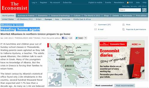 Το Üρθρο ξεκινÜ με το να περιγρÜφει μια σκηνÞ Ýξω απü Ýνα σχολεßο της Θεσσαλονßκης üπου οι μαθητÝς τελειþνουν το μÜθημÜ τους, ενþ τους περιμÝνουν οι γονεßς τους. Οι γονεßς μιλοýν αλβανικÜ, αλλÜ τα παιδιÜ του δημοτικοý αν και εßναι αλβανικÞς καταγωγÞς, γρÜφει το Üρθρο, μιλοýν μüνο ελληνικÜ και δεν Ýχουν πÜει ποτÝ στην πατρßδα τους. Τþρα üμως θα πρÝπει να πÜνε στην Αλβανßα γιατß οι γονεßς τους αναγκÜζονται να επιστρÝψουν λüγω των αντßξοων οικονομικþν συνθηκþν στην ΕλλÜδα. Το Üρθρο αναφÝρει üτι η τελευταßα απογραφÞ στην Αλβανßα Ýδειξε üτι ο πληθυσμüς Ýχει μειωθεß κατÜ 7,7% μÝσα σε μια δεκαετßα και πως περßπου 1,4 εκατομμýρια Αλβανοß Ýχουν μεταναστεýσει στην ΕλλÜδα, μÝσα στα τελευταßα 20 χρüνια. Τþρα üμως το φÜσμα της ανεργßας αναγκÜζει τους Αλβανοýς να επιστρÝψουν στη πατρßδα τους. ΕνδιαφÝρον παρουσιÜζουν τα στοιχεßα του Üρθρου σχετικÜ με τα εμβÜσματα που φτÜνουν στη χþρα τους, την Αλβανßα, τα οποßα λüγω κλßσης Ýχουν αρχßσει και παρουσιÜζουν πτþση. Το 2007 οι αλβανοß μετανÜστες Ýστειλαν στη χþρα τους περßπου 950 εκατ. € (1,3 δις $). Το 2010 ο αριθμüς αυτüς μειþθηκε σε 690 εκατ. € και για τα τρßα πρþτα τρßμηνα του 2011 Þταν μüλις 475 εκατ. €. ΕνδεικτικÜ να αναφÝρουμε üτι το 2009 τα εμβÜσματα Þταν υπολογßσιμη δýναμη για το ΑΕΠ της Αλβανßας μιας και συμμετεßχαν σε ποσοστü 9% αυτοý. Εßναι σημαντικü να αναφÝρουμε üτι η αλβανικÞ οικονομßα τρÝχει με ρυθμü ανÜπτυξης 2,5% μÝσα στο 2011. Το Üρθρο αναφÝρει üτι δεν υπÜρχουν επßσημα στοιχεßα που να καταγρÜφουν πüσοι Αλβανοß επαναπατρßστηκαν και οι αρχÝς της Αλβανßας ισχυρßζονται üτι εßναι πολý λßγοι. Ωστüσο üπως αναφÝρει το Üρθρο πολλοß εßναι οι Αλβανοß που σκÝφτονται την επιστροφÞ και ακüμα περισσüτεροι Ýχουν Þδη φροντßσει να βγÜλουν τα χρÞματÜ τους απü τραπεζικοýς λογαριασμοýς στην ΕλλÜδα και να τα μεταφÝρουν στην Αλβανßα. Επßσης το Üρθρο κÜνει λüγο και για μεταφορÜ επιχειρÞσεων απü την ΕλλÜδα στην Αλβανßα τονßζει üμως πως οι οικονομικÝς και κοινωνικÝς συνθÞκες στη σýγχρονη Αλβανßα παραμÝνουν εξαιρετικÜ δýσκολες. Μπορεßτε να διαβÜστε üλο το Üρθρο του Economist ΕΔΩ |