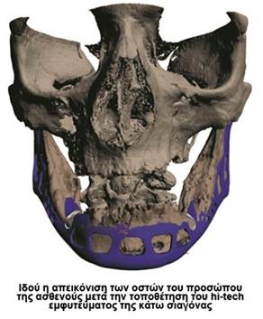 Παγκüσμια πρωτιÜ «Οταν η ασθενÞς ξýπνησε μετÜ την επÝμβαση κατÜφερε να πει λßγες λÝξεις ενþ την επüμενη ημÝρα Þταν σε θÝση να καταπßνει και πÜλι» ανÝφερε ο δρ Ζιλ Πουκενς απü το ΠανεπιστÞμιο Hasselt που ηγÞθηκε της χειρουργικÞς ομÜδας. ΣυμπλÞρωσε üτι «η νÝα θεραπεßα αποτελεß μια παγκüσμια πρþτη καθþς αφορÜ τοποθÝτηση εμφευτεýματος σε ολüκληρη την κÜτω σιαγüνα το οποßο εßναι ‘κομμÝνο και ραμμÝνο’ στα μÝτρα του ασθενοýς». ΤÝσσερις ημÝρες μετÜ την επÝμβαση η 83χρονη επÝστρεψε στο σπßτι της. Η νÝα σιαγüνα της ζυγßζει 107 γραμμÜρια, εßναι δηλαδÞ κατÜ Ýνα τρßτο πιο βαριÜ σε σýγκριση με τη «φυσικÞ» κÜτω σιαγüνα. Ωστüσο οι γιατροß δεν ανησυχοýν και τονßζουν üτι η ασθενÞς θα συνηθßσει εýκολα σε αυτü το επιπλÝον βÜρος μÝσα στο στüμα της. Αργüτερα μÝσα στον μÞνα οι ειδικοß θα υποβÜλουν την 83χρονη σε νÝα επÝμβαση προκειμÝνου να αφαιρÝσουν ορισμÝνα επιπρüσθετα εμφυτεýματα που τοποθÝτησαν σε ειδικÝς οπÝς τις οποßες δημιοýργησαν οι ßδιοι στην επιφÜνεια της σιαγüνας. Στις οπÝς αυτÝς θα εισαχθοýν στη συνÝχεια οδοντικÜ εμφυτεýματα þστε να μπορεß η ασθενÞς να αποκτÞσει Ýνα… κανονικü στüμα. ΣημαντικÜ πλεονεκτÞματα Η ιατρικÞ ομÜδα αναφÝρει πως εκτιμÜ üτι παρüμοιες τεχνικÝς θα αρχßσουν να εφαρμüζονται πολý πιο συχνÜ στα χρüνια που Ýρχονται. «Τα πλεονεκτÞματα εßναι üτι ο χρüνος της χειρουργικÞς επÝμβασης μειþνεται επειδÞ τα εμφυτεýματα εßναι φτιαγμÝνα με βÜση τα μÝτρα του κÜθε ασθενοýς ενþ παρÜλληλα μειþνεται και ο χρüνος νοσηλεßας – üλα αυτÜ βÝβαια οδηγοýν και σε μεßωση του ιατρικοý κüστους» τüνισε ο κýριος Βοτλ. ¼πως εßπε «η συγκεκριμÝνη μÝθοδος επιτρÝπει την ανÜπτυξη εμφυτευμÜτων που δεν μποροýν να δημιουργηθοýν με οποιαδÞποτε Üλλη τεχνικÞ. Για παρÜδειγμα μποροýμε να εκτυπþσουμε πορþδεις δομÝς τιτανßου οι οποßες επιτρÝπουν ανÜπτυξη του οστικοý ιστοý χαρßζοντας στο εμφýτευμα μεγαλýτερο χρüνο ζωÞς και καλýτερη σταθερüτητα». Σýμφωνα με τον κýριο Βοτλ ο απþτερος στüχος εßναι η τρισδιÜστατη εκτýπωση ολüκληρων οργÜνων τα οποßα στη συνÝχεια θα μεταμοσχεýονται στο ανθρþπινο σþμα. Ωστüσο üπως εßπε μια τÝτοια εξÝλιξη εßναι πολý μακρινÞ. «ΥπÜρχουν βιολογικÜ και χημικÜ ζητÞματα που πρÝπει να λυθοýν. ΑυτÞ τη στιγμÞ χρησιμοποιοýμε τη σκüνη ενüς μετÜλλου για την εκτýπωση. ΕÜν θÝλουμε να εκτυπþσουμε ιστοýς και οστÜ χρειαζüμαστε οργανικü υλικü ως ‘μελÜνι’. Τεχνικþς κÜτι τÝτοιο εßναι δυνατüν αλλÜ ο δρüμος εßναι πολý μακρüς μÝχρι να φθÜσουμε σε αυτü το σημεßο».