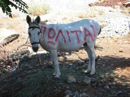 ΑνÝβηκε σε Ýνα παγκÜκι και φþναξε σε üλο τον τοπικü πληθυσμü üτι θα αγüραζε üλα τα γαúδοýρια που θα του πÞγαιναν, Ýναντι 100€ και μÜλιστα μετρητÜ. Οι ντüπιοι το βρÞκαν λßγο περßεργο, αλλÜ η τιμÞ Þταν πολý καλÞ και üσοι προχþρησαν στην πþληση γýρισαν σπßτι με το τσαντÜκι γεμÜτο και το χαμüγελο στα χεßλη. Ο Üνδρας με τη γραβÜτα επÝστρεψε την επüμενη μÝρα και πρüσφερε 150€ για κÜθε αποýλητο γÜιδαρο, κι Ýτσι οι περισσüτεροι κÜτοικοι ποýλησαν τα ζþα τους. Τις επüμενες ημÝρες προσÝφερε 300 ευρþ για üσα ελÜχιστα ζþα Þταν ακüμα αποýλητα με αποτÝλεσμα και οι τελευταßοι αμετανüητοι να πουλÞσουν τα γαúδοýρια τους. ΜετÜ συνειδητοποßησε üτι στο χωριü δεν Ýμεινε πια οýτε Ýνας γÜιδαρος και ανακοßνωσε σε üλους üτι θα επÝστρεφε μετÜ απü μια εβδομÜδα για να αγορÜσει οποιοδÞποτε γÜιδαρο Ýβρισκε Ýναντι ... 500€!! Και αποχþρησε. Την επüμενη μÝρα ανÝθεσε στον συνÝταιρü του το κοπÜδι των γαúδÜρων που εßχε αγορÜσει και τον Ýστειλε στο ßδιο χωριü με εντολÞ να τα πουλÞσει üλα στην τιμÞ των 400 ευρþ το Ýνα. Οι κÜτοικοι βλÝποντας την δυνατüτητα να κερδßσουν 100 ευρþ την επüμενη εβδομÜδα, αγüρασαν ξανÜ τα ζþα τους 4 φορÝς πιο ακριβÜ απü üτι τα εßχανε πουλÞσει, και για να το κÜνουν αυτü, αναγκÜστηκαν να ζητÞσουν ΔΑΝΕΙΟ απü την τοπικÞ τρÜπεζα. ¼πως φαντÜζεστε, μετÜ την συναλλαγÞ οι δýο επιχειρηματßες Ýφυγαν διακοπÝς σε Ýναν φορολογικü παρÜδεισο της ΚαραúβικÞς, ενþ οι κÜτοικοι του χωριοý βρÝθηκαν υπερχρεωμÝνοι, απογοητευμÝνοι, και με τα γαúδοýρια στην κατοχÞ τους που δεν Üξιζαν πλÝον τßποτα. ΦυσικÜ οι αγρüτες προσπÜθησαν να πουλÞσουν τα ζþα για να καλýψουν τα χρÝη. ΜÜταια. Η αξßα τους εßχε πατþσει. Η τρÜπεζα λοιπüν κατÜσχεσε τα γαúδοýρια και εν συνεχεßα τα νοßκιασε στους πρþην ιδιοκτÞτες τους. Ο τραπεζßτης üμως πÞγε στον δÞμαρχο του χωριοý και του εξÞγησε üτι εÜν δεν ανακτοýσε τα κεφÜλαια που εßχε δανεßσει θα κατÝρρεε και αυτüς, και κατÜ συνÝπεια θα ζητοýσε αμÝσως το κλεßσιμο της ανοικτÞς πßστωσης που εßχε με τον δÞμο. Πανικüβλητος ο δÞμαρχος και για να αποφýγει την καταστροφÞ, αντß να δþσει λεφτÜ στους κατοßκους του χωριοý για να καλýψουν τα χρÝη τους, Ýδωσε λεφτÜ στον τραπεζßτη, ο οποßος παρεμπιπτüντως ... Þταν κουμπÜρος του δημοτικοý συμβοýλου... Δυστυχþς üμως ο τραπεζßτης αφοý ανÝκτησε το κεφÜλαιü του, δεν Ýσβησε το χρÝος των κατοßκων, και οýτε το χρÝος του δÞμου, ο οποßος φυσικÜ βρÝθηκε Ýνα βÞμα πριν την πτþχευση. ΒλÝποντας τα χρÝη να πολλαπλασιÜζονται και στριμωγμÝνος απü τα επιτüκια, ο δÞμαρχος ζÞτησε βοÞθεια απü τους γειτονικοýς δÞμους. Αυτοß üμως του Ýδωσαν αρνητικÞ απÜντηση, γιατß üπως του εßπαν εßχαν υποστεß την ßδια ζημιÜ με τους δικοýς τους γαιδÜρους!!... Ο τραπεζßτης τüτε Ýδωσε στον δÞμαρχο την «ανιδιοτελÞ» συμβουλÞ/οδηγßα να μειþσει τα Ýξοδα του δÞμου: λιγüτερα λεφτÜ για τα σχολεßα, για το νοσοκομεßο του χωριοý, για την δημοτικÞ αστυνομßα, κατÜργηση των κοινωνικþν προγραμμÜτων, της Ýρευνας, μεßωση της χρηματοδüτησης για καινοýρια Ýργα υποδομþν... ΑυξÞθηκε η ηλικßα συνταξιοδüτησης, απολýθηκαν οι περισσüτεροι υπÜλληλοι του δημαρχεßου, Ýπεσαν οι μισθοß και αυξÞθηκαν οι φüροι. ¹ταν Ýλεγε αναπüφευκτο, αλλÜ υποσχüταν με αυτÝς τις διαρθρωτικÝς αλλαγÝς «να βÜλει τÜξη στη λειτουργßα του δημοσßου, να βÜλει τÝλος στις σπατÜλες» και να ... ηθικοποιÞσει το εμπüριο των γαúδÜρων. Η ιστορßα Üρχισε να γßνεται ενδιαφÝρουσα üταν μαθεýτηκε πως οι δυο επιχειρηματßες και ο τραπεζßτης 