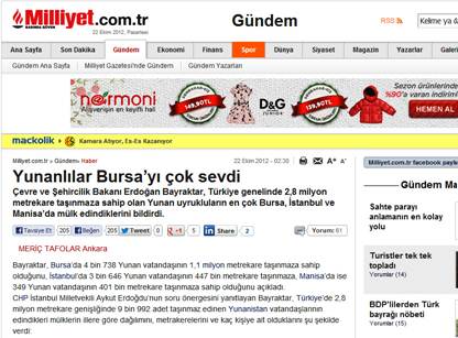 Ο υπουργüς αναφÝρεται και σε ιδιοκτησßες ΕλλÞνων πολιτþν και σε Üλλες πüλεις της Τουρκßας. Ο ΜπαúρακτÜρ απÜντησε σε γραπτÝς ερωτÞσεις του βουλευτÞ του Ρεπουμπλικανικοý Λαúκοý Κüμματος Αúκοýτ ¸ρντογντου σχετικÜ με τους ξÝνους πολßτες που Ýχουν αγορÜσει ακßνητα στην Τουρκßα. Μεταξý των ερωτÞσεων περιλαμβÜνεται και η εξÞς: «Σε ποιους νομοýς κατανÝμονται τα συνολικÞς Ýκτασης 2.837.289 τετρ. μÝτρων ακßνητα που Ýχουν αγορÜσει στην Τουρκßα συνολικÜ 9.992 πολßτες της ΕλλÜδας». Σýμφωνα με την απÜντηση του υπουργοý, εκτüς απü την Προýσα, 3.646 ¸λληνες πολßτες διαθÝτουν ακßνητα Ýκτασης 447.000 τ.τ. στην Κωνσταντινοýπολη, 349 ¸λληνες πολßτες Ýχουν ακßνητα 401.000 τ.τ. στη ΜÜνισα, 1.115 ¸λληνες πολßτες ακßνητα 278.000 τ.τ. Σμýρνη, 448 ¸λληνες πολßτες ακßνητα 122.191 τ.τ. στη ΓιÜλοβα, 52 ¸λληνες πολßτες ακßνητα 106.843 τ.τ. στην Ανδριανοýπολη, 2 ¸λληνες πολßτες ακßνητα 93.252 τ.τ. στο ΤσανÜκλε, 155 ¸λληνες πολßτες ακßνητα 85.538 τ.τ. στο Μπαλικεσßρ, 54 ¸λληνες πολßτες ακßνητα 57.101 τ.τ. στη Ρεδεστü, 30 ¸λληνες πολßτες ακßνητα 39. 200 τ.τ. στο Αúδßνι, 175 ¸λληνες πολßτες ακßνητα 26.349 τ.τ. στο Κοτζαελß, 32 ¸λληνες πολßτες ακßνητα 19.280 τ.τ. στη Μοýγλα, 11 ¸λληνες πολßτες ακßνητα 18.483 τ.τ. στο ΧατÜι, 16 ¸λληνες πολßτες ακßνητα 5.023 τ.τ. στο Μερσßνα, 15 ¸λληνες πολßτες ακßνητα 3.308 τ.τ. στο Εσκισεχßρ, 20 ¸λληνες πολßτες ακßνητα 2.791 τ.τ. στο ¶γκυρα, 17 ¸λληνες πολßτες ακßνητα 2.387 τ.τ. στο , ΣακÜρια, 1 ¸λληνας πολßτης ακßνητα 119 τ.τ. στο Νεβσεχßρ, 1 ¸λληνας πολßτης ακßνητα 450 τ.τ. στο Νεβσεχßρ, 1 ¸λληνας πολßτης ακßνητα 125 τ.τ. στο Ικüνιο, 2 ¸λληνες πολßτες ακßνητα 114 τ.τ. στο ΣαρÜντα εκκλησιÝς ΘρÜκη, 1 ¸λληνας πολßτης ακßνητα 66 τ.τ. στο ΤοκÜτ, 1 ¸λληνας πολßτης ακßνητα 2 τ.τ. στο ΝτουνσÝ Σημειþνεται üτι η Προýσα, üπου σýμφωνα με τα στοιχεßα που δßνει ο Τοýρκος υπουργüς, εßναι πρþτη στον κατÜλογο, εßναι απü τους νομοýς üπου σε μεγÜλο ποσοστü κατοικοýν, Þ αγορÜζουν ακßνητα, οι μουσουλμÜνοι της ΘρÜκης. ¼πως αναφÝρει το ΑΜΠΕ, τÝλος, δßχως να εßναι δυνατüν να εξακριβωθεß το σχετικü ποσοστü, στα συνολικÜ ακßνητα ΕλλÞνων πολιτþν στην ΕλλÜδα περιλαμβÜνονται και τα ακßνητα των ΕλλÞνων υπηκüων Κωνσταντινουπολιτþν που εßχαν απελαθεß το 1964 απü την Τουρκßα, με ταυτüχρονη κατÜσχεση της ακßνητης περιουσßας τους. Η τουρκικÞ κυβÝρνηση του 1988 κατÞργησε τη σχετικÞ «μυστικÞ απüφαση» του τουρκικοý υπουργικοý συμβουλßου του 1964, αλλÜ στην πρÜξη σε πολλÝς απü τις υποθÝσεις αυτÝς υπÜρχουν δικαστικÜ κωλýματα. Παρüμοια εßδηση εßχε προκαλÝσει αßσθηση και στις αρχÝς του Ιουνßου του 2004. Το τουρκικü πρακτορεßο ειδÞσεων «Αναντολοý» εßχε μεταδþσει την πληροφορßα üτι 33,4% των ξÝνων πολιτþν, που διαθÝτουν ακßνητα στη χþρα εßναι ¸λληνες πολßτες, τονßζοντας üτι 14.459 ¸λληνες πολßτες διαθÝτουν 12.557 ακßνητα στην Τουρκßα. ΔιαβÜστε το Üρθρο της MιλιÝτ, στα τοýρκικα, πατþντας ΕΔΩ