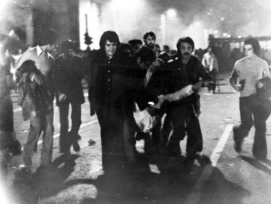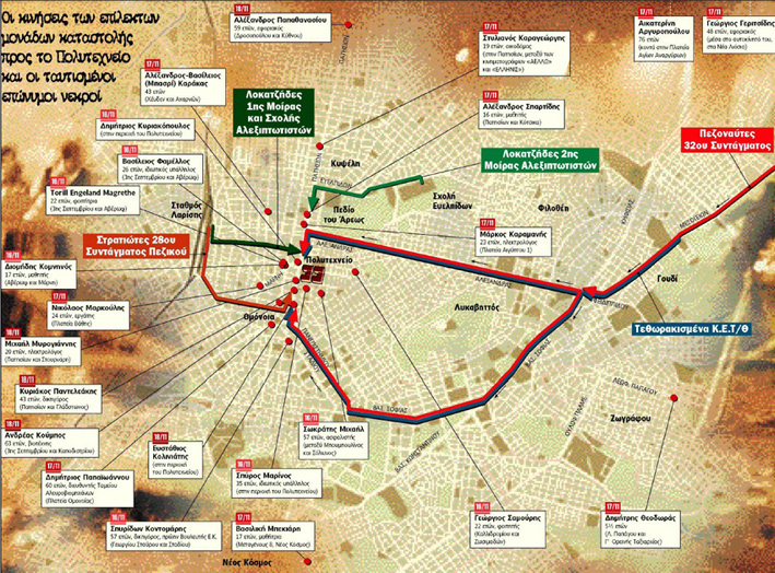 Οι επþνυμοι νεκροß Το Εθνικü ºδρυμα Ερευνþν εßχε προχωρÞσει στην σýνταξη ενüς προσωρινοý καταλüγου των επþνυμων νεκρþν των γεγονüτων του Νοεμβρßου του 1973 κατÜ χρονολογικÞ κατÜταξη. Επßσης παρουσßασε και μια εικονικÞ παρÜσταση των σημεßων των δολοφονιþν πÜνω σε Ýναν χÜρτη του κÝντρου της ΑθÞνας. 1. Σπυρßδων ΚοντομÜρης του Αναστασßου, 57 ετþν, δικηγüρος (πρþην βουλευτÞς Κερκýρας της ¸νωσης ΚÝντρου), κÜτοικος Αγßου Μελετßου, ΑθÞνα. Στις 16.11.1973, γýρω στις 20.30-21.00, ενþ βρισκüταν στη διασταýρωση οδþν Γεωργßου Σταýρου & Σταδßου, προσβλÞθηκε απü δακρυγüνα αÝρια που Ýρριχνε η Αστυνομßα κατÜ των διαδηλωτþν, με αποτÝλεσμα να υποστεß Ýμφραγμα του μυοκαρδßου. ΜεταφÝρθηκε στο Σταθμü Πρþτων Βοηθειþν του Ε.Ε.Σ., üπου διαπιστþθηκε ο θÜνατος του. 2. ΔιομÞδης Κομνηνüς του ΙωÜννη, 17 ετþν, μαθητÞς, κÜτοικος ΛευκÜδος 7, ΑθÞνα. Στις 16.11.1973, μεταξý 21.30 και 21.45, ενþ βρισκüταν μαζß με Üλλους διαδηλωτÝς στη διασταýρωση των οδþν ΑβÝρωφ & ΜÜρνη, τραυματßστηκε θανÜσιμα στην καρδιÜ απü πυρÜ που Ýριξαν εναντßον του Üνδρες της φρουρÜς του Υπουργεßου Δημοσßας ΤÜξεως. ΜεταφÝρθηκε στο Σταθμü Πρþτων Βοηθειþν του Ε.Ε.Σ. και απü εκεß, νεκρüς πλÝον, στο Ρυθμιστικü ΚÝντρο Αθηνþν (üπως λεγüταν τüτε το Γενικü Κρατικü Νοσοκομεßο). 3. ΣωκρÜτης ΜιχαÞλ, 57 ετþν, εμπειρογνþμων ασφαλιστικÞς εταιρεßας, κÜτοικος Περιστερßου ΑττικÞς. Στις 16.11.1973, μεταξý 21.00 και 22.30, ενþ βρισκüταν μεταξý των οδþν Μπουμπουλßνας και Σüλωνος, προσβλÞθηκε απü δακρυγüνα αÝρια που Ýρριχνε η Αστυνομßα κατÜ των διαδηλωτþν, με αποτÝλεσμα να υποστεß απüφραξη της αριστερÜς στεφανιαßας. ΜεταφÝρθηκε ημιθανÞς στο Σταθμü Πρþτων Βοηθειþν του Ε.Ε.Σ. (3ης Σεπτεμβρßου), üπου και πÝθανε. 4. Toril Margrethe Engeland του Per Reidar, 22 ετþν, φοιτÞτρια απü το Molde της Νορβηγßας. Στις 16.11.1973, γýρω στις 23.30, τραυματßστηκε θανÜσιμα στο στÞθος απü πυρÜ της φρουρÜς του Υπουργεßου Δημοσßας ΤÜξεως. ΜεταφÝρθηκε απü διαδηλωτÝς στο ξενοδοχεßο «Ακροπüλ» και αργüτερα, νεκρÞ Þδη, στο Σταθμü Πρþτων Βοηθειþν του Ι.Κ.Α. Ανακριβþς εßχε αναφερθεß αρχικÜ απü την Αστυνομßα ως «Αιγυπτßα Τουρßλ ΤεκλÝτ» και η παρεξÞγηση αυτÞ επιβιþνει ακüμη σε κÜποιους «καταλüγους νεκρþν». 5. Βασßλειος ΦÜμελλος του Παναγιþτη, 26 ετþν, ιδιωτικüς υπÜλληλος, απü τον Πýργο Ηλεßας, κÜτοικος ΚÜσου 1, ΚυψÝλη, ΑθÞνα. Στις 16.11.1973, γýρω στις 23.30, τραυματßστηκε θανÜσιμα στο κεφÜλι απü πυρÜ της φρουρÜς του Υπουργεßου Δημοσßας ΤÜξεως. ΜεταφÝρθηκε απü διαδηλωτÝς στο Σταθμü Πρþτων Βοηθειþν του Ε.Ε.Σ. και απü εκεß, νεκρüς πλÝον, στο Ρυθμιστικü ΚÝντρο Αθηνþν. 6. Γεþργιος Σαμοýρης του ΑνδρÝα, 22 ετþν, φοιτητÞς Παντεßου, απü την ΠÜτρα, κÜτοικος πλατεßας Κουντουριþτου 7, ΚουκÜκι. Στις 16.11.1973 γýρω στις 24.00, ενþ βρισκüταν στην ευρýτερη περιοχÞ του Πολυτεχνεßου (Καλλιδρομßου και ΖωσιμÜδων), τραυματßστηκε θανÜσιμα στον τρÜχηλο απü πυρÜ της αστυνομßας. ΜεταφÝρθηκε στο πρüχειρο ιατρεßο του Πολυτεχνεßου, üπου απεβßωσε. Απü εκεß μεταφÝρθηκε στο Σταθμü Πρþτων Βοηθειþν του Ι.Κ.Α. Ανακριβþς εßχε αναφερθεß αρχικÜ απü την Αστυνομßα ως «ΧαμουρλÞς». 7. ΔημÞτριος Κυριακüπουλος του Αντωνßου, 35 ετþν, οικοδüμος, απü τα ΚαλÜβρυτα, κÜτοικος Περιστερßου ΑττικÞς. ΚατÜ τις βρÜδυνες þρες της 16.11.1973 ενþ βρισκüταν στην περιοχÞ του Πολυτεχνεßου, προσβλÞθηκε απü δακρυγüνα αÝρια και στη συνÝχεια κτυπÞθηκε απü αστυνομικοýς με συμπαγεßς ρÜβδους, συνεπεßα των οποßων πÝθανε, απü οξεßα ρÞξη αορτÞς, τρεις ημÝρες αργüτερα, στις 19.11.1973, ενþ μεταφερüταν στο Σταθμü Π