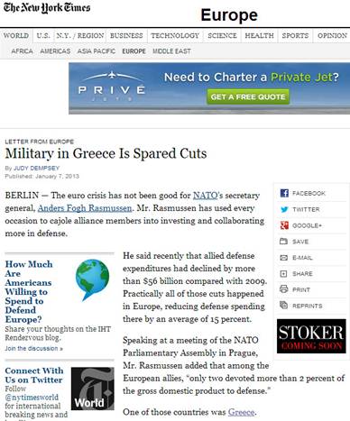 ΔιαβÜστε ολüκληρο το Üρθρο üπως δημοσιεýεται στην ηλεκτρονικÞ Ýκδοση της New York Times με τßτλο: «Military in Greece Is Spared Cuts» |