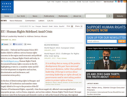 ΑναφÝροντας και την σχετικÞ καταδßκη της ΕλλÜδας απü την ΕπιτροπÞ του ΟΗΕ ΚατÜ των Βασανιστηρßων (CAT), η Ýκθεση στηλιτεýει νüμο που ψηφßστηκε τον Απρßλιο σýμφωνα με τον οποßο η αστυνομßα μπορεß να συλλαμβÜνει μετανÜστες με την «ασαφÞ αιτιολογßα του κινδýνου για τη δημüσια υγεßα» - üπως το «πüσο επιρρεπεßς εßναι σε μολυσματικÝς ασθÝνειες με βÜση τη χþρα καταγωγÞς τους». Η οργÜνωση αυτÞ που εδρεýει στη ΝÝα Υüρκη και παρακολουθεß την κατÜσταση των ανθρωπßνων δικαιωμÜτων σε üλο τον κüσμο - συντÜσσοντας μια ετÞσια Ýκθεση τα τελευταßα 23 χρüνια - κατακρßνει την κυβÝρνηση ΣαμαρÜ επειδÞ «συνÝχισε την σκληρÞ προσÝγγιση της προκατüχου της üσον αφορÜ τον Ýλεγχο της μετανÜστευσης». ΦÝρνει ως παρÜδειγμα τον 12,5 χλμ φρÜχτη που χτßστηκε στον ¸βρο, στα σýνορα με την Τουρκßα, και τις επιχειρÞσεις - σκοýπα ΞÝνιος Ζευς που οδÞγησαν «στην κρÜτηση περισσüτερων απü 50.000 φερüμενων ως μεταναστþν χωρßς Ýγγραφα οι οποßοι συνελÞφθησαν μüνο και μüνο λüγω της εμφÜνισÞς τους ενþ περισσüτεροι απü 3.700 κρατÞθηκαν». Παρüτι ιδρýθηκαν νÝες υπηρεσßες για την διεκπεραßωση των αιτÞσεων για Üσυλο τον ΜÜρτιο, ως το τÝλος του Ýτους «δεν εßχαν αρχßσει ακüμη να λειτουργοýν κανονικÜ λüγω καθυστÝρησης στην επÜνδρωσÞ τους». Η Ýκθεση χαρακτηρßζει «προβληματικÝς» τις συνθÞκες διαβßωσης στα πÝντε νÝα κÝντρα κρÜτησης παρÜνομων μεταναστþν που δημιουργÞθηκαν πÝρσι στην ΕλλÜδα. ΑνÜμεσα στα προβλÞματα που αναφÝρει για üλα αυτÜ τα κÝντρα, νÝα και παλαιÜ, εßναι «ο συνωστισμüς, η Üσχημη υγειονομικÞ κατÜσταση και η περιορισμÝνη πρüσβαση σε περßθαλψη, νερü και τροφÞ». Θεωρþντας την εκλογÞ της ακροδεξιÜς ΧρυσÞς ΑυγÞς στη ΒουλÞ ως απειλÞ για τα ανθρþπινα δικαιþματα, η οργÜνωση τονßζει üτι «η ξενοφοβικÞ βßα Ýχει λÜβει ανησυχητικÝς διαστÜσεις, καθþς μετανÜστες και πρüσφυγες γßνονται τακτικÜ στüχος επιθÝσεων, ενþ υπÜρχουν αυξανüμενες αποδεßξεις για την ανÜμειξη μελþν της ΧρυσÞς ΑυγÞς». ΕκφρÜζει επßσης την ανησυχßα για το üτι τον ΜÜιο η κυβÝρνηση δημοσιοποßησε τις φωτογραφßες και προσωπικÜ στοιχεßα ιερüδουλων κατηγοροýμενων üτι, ενþ Þταν φορεßς του Aids, δεν Ýπαιρναν τις απαραßτητες προφυλÜξεις με τους πελÜτες τους. Για την υπüλοιπη Ευρþπη, οι ανησυχßες που διατυπþνονται στην Ýκθεση της Human Rights Watch αφοροýν κυρßως ΡομÜ (Γαλλßα), πρüσφυγες (Γερμανßα και Ιταλßα), διακρßσεις εις βÜρος κοινωνικþν ομÜδων (Ουγγαρßα), εκλογÞ ακροδεξιοý κüμματος (Ολλανδßα) και αστυνομικÞ βßα (Ισπανßα). Σημειþνει üτι η εισροÞ μεταναστþν στην Ευρþπη δια θαλÜσσης μÝσω της Μεσογεßου Ýχει μειωθεß, «αν και περισσüτεροι απü 300 Üνθρωποι πνßγηκαν απü ΙανουÜριο ως ΝοÝμβριο». ΚÜνοντας ειδικÞ μνεßα στους ασυνüδευτους ανÞλικους μετανÜστες στην Ευρþπη, καυτηριÜζει ΕλλÜδα, ΜÜλτα και Ιταλßα για το üτι δεν καταγρÜφουν ορθÜ την ηλικßα αυτþν και τις δýο πρþτες επειδÞ επιτρÝπουν την κρÜτηση των ανηλßκων παρÜνομων μεταναστþν. ¼σον αφορÜ τον υπüλοιπο κüσμο, η κυριüτερη ανησυχßα - την οποßα εξÝφρασε ο διευθυντÞς της οργÜνωσης ΚÝνεθ Ροθ στη διÜρκεια της παρουσßασης της ετÞσιας Ýκθεσης στις ΗΠΑ - επικεντρþνεται στις εξελßξεις στη ΜÝση ΑνατολÞ: «Δυο χρüνια μετÜ την ΑραβικÞ ¶νοιξη, η ευφορßα μοιÜζει παρελθüν. Οι ημÝρες διαμαρτυρßας και θριÜμβου Ýδωσαν τη θÝση τους στην οργÞ για τις κτηνωδßες στη Συρßα, στην απογοÞτευση για το üτι οι μονÜρχες της περιοχÞς δεν υποκýπτουν στην πßεση για μεταρρυθμßσεις και στον φüβο üτι οι κερδισμÝνοι των επ