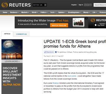 «Τον περασμÝνο ΝοÝμβριο, οι υπουργοß Οικονομικþν των κρατþν-μελþν της ευρωζþνης και το ΔΝΤ συμφþνησαν να μεταβιβÜσουν τα κÝρδη απü το χαρτοφυλÜκιο των κερδþν απü τα ελληνικÜ ομüλογα του ευρωσυστÞματος στην ΑθÞνα απü το 2013 και εξÞς, για την εξυπηρÝτηση του χρÝους της ΕλλÜδας» γρÜφει, μεταξý Üλλων, το πρακτορεßο ειδÞσεων. Το Reuters αναφÝρει üτι το ποσοστü της ΕΚΤ απü τα κÝρδη του ΕυρωσυστÞματος εßναι 8%, το οποßο εÜν αναχθεß προς την κλßμακα του συνüλου μπορεß να αντιστοιχηθεß σε κÝρδη περßπου 6 δισ. ευρþ απü τα ελληνικÜ ομüλογα. Παρüλα αυτÜ τα χρεüγραφα που διακρατοýνται δεν εßναι επιμερισμÝνα ισομερþς και τα συνολικÜ κÝρδη ενδÝχεται να αποδειχθοýν μικρüτερα. ΠαρουσιÜζοντας λεπτομερειακÜ τον ισολογισμü της για το 2012, η ΕΚΤ ανακοßνωσε σÞμερα πως συνολικÜ αποκüμισε 1,108 δισ. ευρþ απü το πρüγραμμα αγορÜς κρατικþν ομολüγων (SΜΡ) πÝρυσι και τα καθαρÜ της κÝρδη αυξÞθηκαν στα 998 εκατ. ευρþ απü 728 εκατ. την προηγοýμενη χρονιÜ. Σýμφωνα με το σχÝδιο, η ΕΚΤ θα καταβÜλλει το ποσοστü των κερδþν της απü το SMP στις εθνικÝς κεντρικÝς τρÜπεζες. ΑυτÝς με τη σειρÜ τους θα προσθÝσουν τα δικÜ τους κÝρδη απü το πρüγραμμα εξαγορÜς ελληνικþν ομολüγων που διακρατοýν και θα μεταβιβÜσουν τα κÝρδη στις κυβερνÞσεις τους, οι οποßες με τη σειρÜ τους θα τα στεßλουν στην ΑθÞνα.