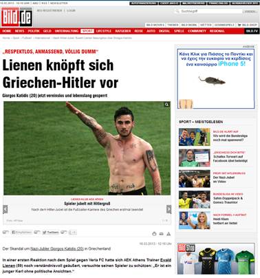 Στον ναζιστικü χαιρετισμü του Κατßδη και τον ισüβιο αποκλεισμü του απü τις εθνικÝς ομÜδες αναφÝρεται η Huffigton Post στην πρþτη σελßδα, δßνοντας μια αναλυτικÞ περιγραφÞ του επßμαχου γεγονüτος. Η Huffigton post αναφÝρει: «Η ΕλληνικÞ ποδοσφαιρικÞ ομοσπονδßα ανÝφερε την ΚυριακÞ σε δÞλωσÞ της, üτι η χειρονομßα του μÝσου της ΑΕΚ εßναι μια βαθιÜ προσβολÞ προς üλα τα θýματα της ΝαζιστικÞς θηριωδßας. Ο 20χρονος Κατßδης Ýκανε Ýναν ναζιστικü χαιρετισμü, üταν πÝτυχε το γκολ που Ýδωσε το προβÜδισμα στη νßκη της ΑΕΚ με 2-1 εναντßον της ΒÝροιας στο ελληνικü πρωτÜθλημα. Ομολüγησε την ÜγνοιÜ του για την Ýννοια της χειρονομßας, - το δεξß του χÝρι εκτεταμÝνο και ßσιο. Ισχυρßστηκε στον λογαριασμü του στο Twitter üτι απεχθÜνεται τον φασισμü. Η ΑΕΚ και το Ελληνικü πρωτÜθλημα, εξετÜζουν την επιβολÞ διαφορετικþν κυρþσεων. Οι οπαδοß της ΑΕΚ απαιτοýν την απομÜκρυνση του Κατßδη απü την ομÜδα».
