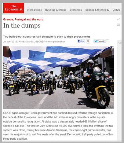 ¼πως υποστηρßζει δημοσßευμα του Economist αυτü που διακυβευüταν Þταν η απολýτως αναγκαßα δüση των 6,8 δισ. ευρþ της ελληνικÞς διÜσωσης. «Η ψηφοφορßα στις 17 Ιουλßου για την περικοπÞ 15.000 θÝσεων του δημοσßου και την αναδιÜρθρωση του φορολογικοý συστÞματος Þταν οριακÞ, κυρßως διüτι ο Αντþνης ΣαμαρÜς, ο κεντροδεξιüς πρωθυπουργüς, εßδε την πλειοψηφßα του να μειþνεται σε μüλις πÝντε Ýδρες μετÜ απü την αποχþρηση της ΔημοκρατικÞς ΑριστερÜς απü τον συνασπισμü». Ο Economist υποστηρßζει üτι ο Α. ΣαμαρÜς Ýπρεπε να βγÜλει την τελευταßα στιγμÞ Ýναν «Üσο» για να κερδßσει τους διαφωνοýντες. ¿ρες πριν απü την ψηφοφορßα ανακοßνωσε τη μεßωση του ΦΠΑ στην εστßαση απü το 23% στο 13%. ΕÜν αυτü παρÜγει Ýσοδα, üπως εκτιμÜ το υπουργεßο Οικονομικþν, θα παραμεßνει. Η ΕΕ και το ΔΝΤ εßναι σκεπτικοß, αλλÜ εßναι Ýτοιμοι να το προσπαθÞσουν». Η ανακοßνωση αυτÞ του Α. ΣαμαρÜ Þρθε λßγο πριν απü την επßσκεψη του Γερμανοý υπουργοý Οικονομικþν Wolfang Schaeuble, στην ΑθÞνα, για να παροτρýνει τους ¸λληνες να εμμεßνουν στις μεταρρυθμßσεις και να παρουσιÜσει Ýνα γερμανü-ελληνικü ταμεßο στÞριξης των μικρþν ελληνικþν επιχειρÞσεων. Τονßζει ακüμη üτι ο ΚυριÜκος ΜητσοτÜκης, υπουργüς ΔιοικητÞς Μεταρρυθμßσης, πρÝπει να απολýσει 4.000 δημοσßους υπαλλÞλους φÝτος και Üλλους 11.000 το 2014. «Οι πρþτοι που θα φýγουν εßναι οι 2.000 υπÜλληλοι της δημüσιας τηλεüρασης, ακολουθοýμενοι απü τους δημοτικοýς αστυνομικοýς, εργαζüμενους σε νοσοκομεßα και εκπαιδευτικοýς επαγγελματικÞς κατÜρτισης. Η παλιÜ ζωÞ στο δημüσιο, με υψηλοýς μισθοýς και λιγüτερες þρες εργασßας απü ü,τι στον ιδιωτικü τομÝα, Ýχει τελειþσει. Το παιχνßδια Ýχει αλλÜξει για τα καλÜ, üπως δÞλωσε ο Κ. ΜητσοτÜκης, αναφÝρει ο Economist. Ωστüσο, τονßζει üτι υπÜρχουν ελÜχιστες ενδεßξεις οικονομικÞς ανÜκαμψης. Ο ΙΟΒΕ δÞλωσε üτι το ΑΕΠ θα συρρικνωθεß κατÜ περισσüτερο απü 5% φÝτος, χειρüτερα απü την προηγοýμενη πρüβλεψη για 4,6%, η ανεργßα αναμÝνεται να διαμορφωθεß στο 30% το επüμενο Ýτος απü το 26,9% φÝτος και τα Ýσοδα απü τις ιδιωτικοποιÞσεις εßναι απογοητευτικÜ: «η ΕλλÜδα θα χÜσει το φετινü στüχο με ευρý περιθþριο». Τονßζει ακüμη üτι η κατÜσταση εßναι ελÜχιστα καλýτερη στην Πορτογαλßα, üπου το κüστος της λιτüτητας των τελευταßων δýο ετþν Ýχει διαλýσει τον κυβερνητικü συνασπισμü του Passos Coelho, προκαλþντας πολιτικÞ κρßση. «¼λα αυτÜ εßναι μÜλλον απßθανο να ενισχýσουν την εμπιστοσýνη στην Πορτογαλßα, την ΕλλÜδα Þ την ευρýτερη ευρωζþνη, üτι η λιτüτητα Ýχει αποτÝλεσμα. Οýτε θα υποστηρßξει τις ελπßδες στις ΒρυξÝλλες üτι η Πορτογαλßα αποτραβιÝται μακριÜ απü την ΕλλÜδα με ασφÜλεια και θα ακολουθÞσει την Ιρλανδßα στην Ýξοδο απü το πρüγραμμα διÜσωσης. ΑυτÞ τη στιγμÞ, καμßα απü τις δýο χþρες δεν φαßνεται üτι εßναι κοντÜ στο να αποφοιτÞσει».