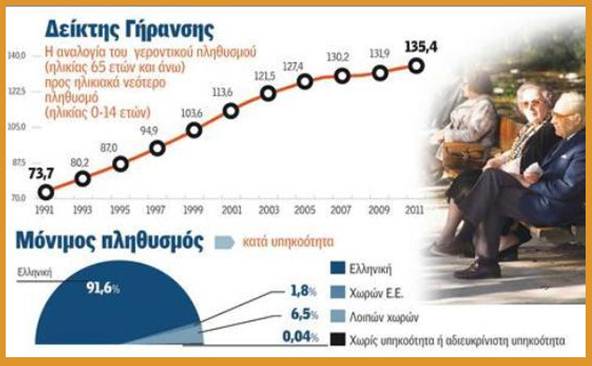 Με τον νüμιμο πληθυσμü της χþρας να φτÜνει τα 10.815197 Üτομα και τον νüμιμο πληθυσμü (δημüτες) να εßναι 9.903.268 πολßτες, ιδιαßτερη σημασßα Ýχουν τα επιμÝρους χαρακτηριστικÜ στοιχεßα. Για παρÜδειγμα, ποιος γνωρßζει üτι ο αριθμüς των ατüμων ηλικßας Üνω των 65 ετþν Ýχει ξεπερÜσει τα 2 εκατ., γεγονüς που αποτελεß «βüμβα» για τα ασφαλιστικÜ ταμεßα; Ακüμη πιο εντυπωσιακü εßναι το γεγονüς üτι υπÜρχουν 1,6 εκατ. Ελληνες, δηλαδÞ πÜνω απü το 15%, που εßναι πÜνω απü 70 ετþν. ¹ ποιος ξÝρει üτι εν Ýτει 2013 στην ΕλλÜδα υπÜρχουν 250 παιδιÜ Ýως 14 ετþν τα οποßα εßναιμ παντρεμÝνα και δýο απü αυτÜ και διαζευγμÝνα; ¶κρως ενδιαφÝρον και το γεγονüς üτι η Ηπειρος εßναι η πιο γερασμÝνη περιφÝρεια της χþρας, ενþ στα νησιÜ φαßνεται να επικρατοýν οι νÝοι.