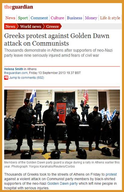 Σε δημοσßευμα της, η βρετανικÞ εφημερßδα αναφÝρεται στην επßθεση την οποßα χαρακτηρßζει «δολοφονικÞ», αλλÜ και στις συγκεντρþσεις διαμαρτυρßας που πραγματοποιÞθηκαν την ΠαρασκευÞ, κατÜ του ακροδεξιοý μορφþματος. «ΠεριγρÜφεται ως μια δολοφονικÞ επßθεση και η πιο σοβαρÞ βιαιοπραγßα απü τüτε που η εξτρεμιστικÞ ομÜδα μπÞκε στο Κοινοβοýλιο. 50 Üτομα με λοστοýς και ρüπαλα χτυποýσαν αριστεροýς καθþς κολλοýσαν αφßσες στην εργατικÞ περιοχÞ του ΠερÜματος», σημειþνει ο Guardian. Στη συνÝχεια, το δημοσßευμα σχολιÜζει περαιτÝρω την επßθεση των ακροδεξιþν σημειþνοντας πως ενüψει του 39ου φεστιβÜλ της ΚΝΕ, «η επßθεση Ýρχεται εν μÝσω φüβων πως η ακροδεξιÜ προσπαθεß να δημιουργÞσει μια εμφυλιοπολεμικÞ ατμüσφαιρα στην ΕλλÜδα. ΠροβεβλημÝνα μÝλη Üλλωστε της ΧρυσÞς ΑυγÞς, Ýχουν προβλÝψει πως η χτυπημÝνη απü την κρßση χþρα οδηγεßται σε Εμφýλιο», τονßζει ο Guardian. ΠαρÜλληλα, ο Guardian παραθÝτει και δηλþσεις αναλυτþν οι οποßοι υποστηρßζουν πως «η επßθεση των χρυσαυγιτþν αποδεικνýει την αυτοπεποßθηση τους και την ικανüτητα τους να εξαπλþνουν την επιρροÞ τους και στοχεýουν στις γειτονιÝς της μεσαßας τÜξης των Αθηνþν. Κλεßνοντας, ο Guardian αναφÝρει πως «πολλοß σχολιαστÝς Ýχουν αρχßσει να αναρωτιοýνται εÜν η συντηρητικÞ κυβÝρνηση θα Ýπρεπε να συνεργαστεß με την ΧρυσÞ ΑυγÞ, καθþς οι απüψεις τους σε θÝματα δημüσιας τÜξης, εßναι ενοχλητικÜ ßδιες». ΔιαβÜστε πατþντας ΕΔΩ το δημοσßευμα του Guardian στα αγγλικÜ