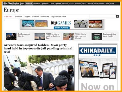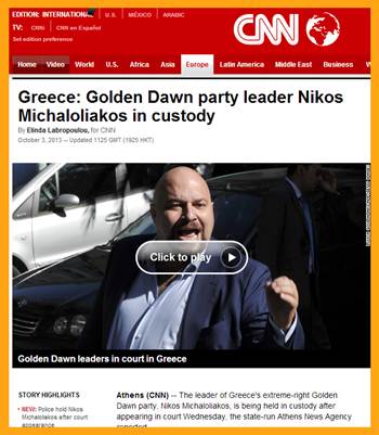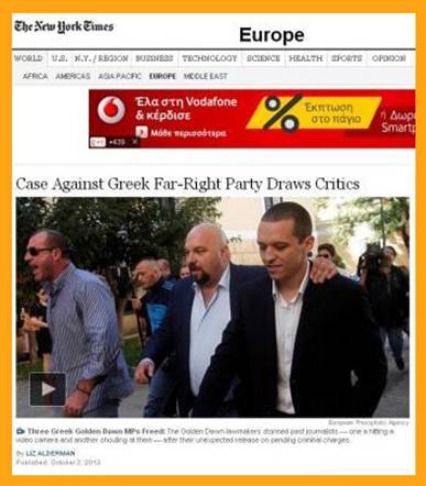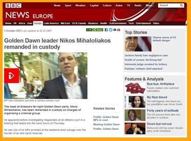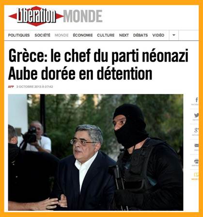του Παýλου Φýσσα και δηλþνει «δεν εßμαι ναζß». «Η κυβÝρνηση ελπßζει üτι οι γλαφυρÝς μαρτυρßες... για την δρÜση της ΧρυσÞς ΑυγÞς, θα καταστρÝψουν μßα και καλÞ την εικüνα του κüμματος» τονßζει ο ανταποκριτÞς του BBC. «Εδþ και δυο εβδομÜδες, οι ελληνικÝς αρχÝς, επιχειροýν να εξαρθρþσουν την ΧρυσÞ ΑυγÞ, μετÜ την δολοφονßα του αντιφασßστα ρÜπερ, Παýλου Φýσσα…» αναφÝρει η Monde, μεταδßδοντας τις τελευταßες εξελßξεις και σημειþνοντας: «Η επιχεßρηση των ελληνικþν αρχþν εναντßον της ΧρυσÞς ΑυγÞς Ýρχεται ενþ η ΑθÞνα ετοιμÜζεται να αναλÜβει την 1η Ιανουαρßου την κυλιüμενη προεδρßα της ΕΕ και ενüσω συνεχßζονται οι συνομιλßες με τους διεθνεßς δανειστÝς για την εκταμßευση της επüμενης δüσης». Στην ηλεκτρονικÞ Ýκδοση του γαλλικοý εντýπου το κýριο Üρθρο τιτλοφορεßται: H πτþση του Νßκου ΜιχαλολιÜκου, του μικροý Ελληνα Φýρερ. Στο δημοσßευμα σχολιÜζεται η «Κατηγοροýμενη επß μακρüν για αδρÜνεια απÝναντι στην Üνοδο της ακροδεξιÜς, η ελληνικÞ κυβÝρνηση αποφÜσισε να περÜσει στην επßθεση» σημειþνει η γαλλικÞ εφημερßδα Le Figaro, κÜνοντας αναφορÜ στην προφυλÜκιση του Ν. ΜιχαλολιÜκου καθþς και στο παρελθüν του τελευταßου: τους δεσμοýς με τον δικτÜτορα Παπαδüπουλο, την εποχÞ της ΕΠΕΝ, την ßδρυση της ΧΑ, την δεκαετßα του 1980 και την γρÞγορη Üνοδο του κüμματος εν μÝσω κρßσης. Αναφερüμενοι στο "ξÞλωμα" της ΧΑ, οι New York Times γρÜφουν üτι σοβαρÜ ερωτηματικÜ εγεßρονται για το σχεδιασμü και την αποτελεσματικüτητα των συλλÞψεων "και για το εÜν θα γυρßσει μποýμερανγκ κατÜ της κυβÝρνησης και εÜν θα καταλÞξει να προκαλÝσει συμπÜθεια για τη ΧρυσÞ ΑυγÞ, μßα απü τις πιο βßαιες ακροδεξιÝς οργανþσεις της Ευρþπης". "ΕρωτÞσεις Ýχουν Þδη τεθεß για τη νομιμüτητα, ακüμα και τη συνταγματικüτητα, των μεθüδων της κυβÝρνησης" γρÜφει η εφημερßδα, μιλþντας για "απüφαση-Ýκπληξη" της Δικαιοσýνης για την απελευθÝρωση των τριþν βουλευτþν. Η εφημερßδα αναφÝρεται και στη συμπεριφορÜ του Ηλßα ΚασιδιÜρη, ο οποßος βγαßνοντας απü το δικαστÞριο αποκÜλεσε τους δημοσιογρÜφους "αλÞτες" και Ýσπρωξε τους φωτογρÜφους.