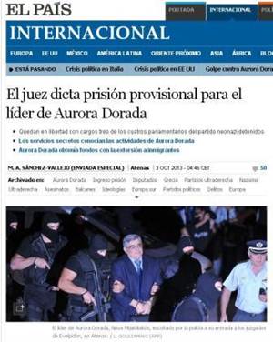 Επßσης η Washington PostÝχει τßτλο "ΠροφυλακιστÝος ο αρχηγüς του ελληνικοý ακροδεξιοý κüμματος εν üψει της δßκης". "Ο δικαστÞς αποφασßζει την προφυλÜκιση του ηγÝτη της ΧρυσÞς ΑυγÞς" τιτλοφορεßται η El Pais, η οποßα στο Üρθρο της αναφÝρεται στη φερüμενη εκβιαστικÞ δρÜση της παρÜταξης κατÜ των μεταναστþν και σχολιÜζει üτι οι ελληνικÝς μυστικÝς υπηρεσßες γνþριζαν τη δραστηριüτητα της Χ.Α. Το Spiegel üσον αφορÜ τα δημοσιεýματÜ του σχετικÜ με τη ΧρυσÞ ΑυγÞ αναφÝρεται στην απελευθÝρωση υπü üρους των τριþν βουλευτþν και πως αυτÞ η απüφαση εßναι πλÞγμα για την κυβÝρνηση στην ΑθÞνα. |