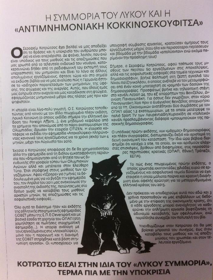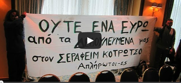 Οι απλÞρωτοι εργαζüμενοι Ýκαναν Ýφοδο στην εκδÞλωση, προπηλÜκισαν φραστικÜ τον ßδιο αλλÜ και τους παρευρισκüμενους πολιτικοýς και ανÜγκασαν τους περισσüτερους να αποχωρÞσουν ενþ διεκüπη η παρουσßαση βιβλßου. Οι απλÞρωτοι εργαζüμενοι τα Ýβαλαν κυρßως με τους βουλευτÝς του ΣΥΡΙΖΑ που βρßσκονταν στο πÜνελ και στην αßθουσα. ΑποκÜλεσαν «αλÞτη» τον βουλευτÞ ΔημÞτρη Παπαδημοýλη καθþς και τον Νßκο Κωνσταντüπουλο, οι οποßοι Þταν απü τους παρουσιαστÝς του βιβλßου. «Ποý πας; ¼λο λες, λες, για κÜτσε να μας τα πεις κι εδþ» φþναξαν στον βουλευτÞ του ΣΥΡΙΖΑ ΔημÞτρη Στρατοýλη. Ο κ. Κοτρþτσος, αποδοκιμαζüμενος απü τους εργαζομÝνους, πÞρε το μικρüφωνο και επιχεßρησε να εξηγÞσει ενþπιον απλÞρωτων εργαζομÝνων, κοινοý και τηλεοπτικþν συνεργεßων γιατß Ýκλεισε η εφημερßδα «Αποκαλýψεις» και γιατß Ýμειναν απλÞρωτοι οι Üνθρωποι. ¼ταν Þρθε η σειρÜ του ΔημÞτρη Παπαδημοýλη να πÜρει το λüγο üλοι Ýμειναν Üφωνοι ακοýγοντÜς τον, σε λßγα δευτερüλεπτα, απü συμπαρουσιαστÞς του βιβλßου να μεταμορφþνεται σε κατÞγορο του Σεραφεßμ Κοτρþτσου και να τον «αδειÜζει» με τον πιο ωμü τρüπο προκειμÝνου να γßνει αρεστüς στους απλÞρωτους εργαζüμενους που Ýκαναν Ýφοδο. «Σε τÝτοιες συγκροýσεις και αντιπαραθÝσεις, το κüμμα μου ο ΣΥΡΙΖΑ κι εγþ, εßμαστε με τους εργαζομÝνους. Θεωροýμε απαρÜδεκτο σε ανθρþπους που προσÝφεραν εργασßα να μην πληρþνονται. Σκοπεýουμε να φÝρουμε το θÝμα στη ΒουλÞ και να πÜμε μαζß σας στην Επιθεþρηση Εργασßας για üποιες εκκρεμüτητες Ýχετε με τον εργοδüτη Κοτρþτσο. Εßμαστε μαζß σας και χαιρετßζουμε και την παρÝμβασÞ σας εδþ» εßπε ο ΔημÞτρης Παπημοýλης, χαιρετßζοντας ουσιαστικÜ την διÜλυση της εκδÞλωσης. (Η παρÝμβασÞ του στο 4:45 του βßντεο) ΑμÝσως μüλις Ýκλεισε την παρÝμβασÞ του Ýκλεισε το μικρüφωνο και αποχþρησε απü το πÜνελ! Ο Σεραφεßμ Κοτρþτσος παρουσßαζε το νÝο βιβλßο του «Wolf-Gang, Η Συμμορßα του Λýκου (Το Σιδηροýν ΠαραπÝτασμα των Μνημονßων)», εκδüσεις ΛιβÜνη, στο ξενοδοχεßο Athens Plaza Στο πÜνελ των παρουσιαστþν Þταν οι Νßκος Κωνσταντüπουλος, ΔημÞτρης Παπαδημοýλης, ΝικÞτας ΚακλαμÜνης, ΣτÝλιος ΠερρÜκης και ο πρþην ευρωβουλευτÞς Γιþργος ΧατζημαρκÜκης ενþ παρουσιαστÞς της εκδÞλωσης Þταν ο Νßκος ΧατζηνικολÜου. Παρüντες στην παρουσßαση του βιβλßου του Σεραφεßμ Κοτρþτσου Þταν οι βουλευτÝς ΡÝνα Δοýρου, Κþστας Μαρκüπουλος, Γιþργος ΒαρεμÝνος, Κþστας ΤζαβÜρας, Γιþργος Ντüλιος, Προκüπης Παυλüπουλος, ΔημÞτρης Στρατοýλης και πολλοß Üλλοι καθþς και ο Κþστας Λαλιþτης