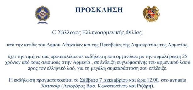 ¼ταν πριν απü 25 χρüνια ο σεισμüς πλÞγωσε την Αρμενßα και τον αρμενικü λαü, αμÝσως ο ελληνικüς λαüς Þρθε να του συμπαρασταθεß και μÜλιστα επß του πρακτÝου. Δεν πιÝστηκε απü κανÝναν και το Ýκανε αυθüρμητα, γιατß αυτÞ η φιλßα υπÜρχει και μετατρÜπηκε εκεßνη την περßοδο σε συμπüνια. ΥπÜρχει και πρακτικÞ μαρτυρßα στο κÝντρο της ΑθÞνας, αφοý η Αρμενßα Ýκανε Ýνα δþρο συμβολικü στην ΕλλÜδα. Εßναι Ýνα ΧατσκÜρ, ο πÝτρινος σταυρüς, που εßναι πÜντα μοναδικüς και αποτελεß το σημεßο αναφορÜς για τους αρμενικοýς τÜφους. Αν συνδυÜσουμε αυτÜ τα γεγονüτα και στη συνÝχεια την αναγνþριση της γενοκτονßας των Αρμενßων απü τη ΒουλÞ των ΕλλÞνων το 1996 μποροýμε να καταλÜβουμε üτι το κοινü υπüβαθρο εßναι πολý βαθý. Και αυτü σημαßνει με Üλλα λüγια üτι εßμαστε λαοß που οýτε οι γενοκτονßες, οýτε οι σεισμοß δεν κατÜφεραν να μας εξοντþσουν. ΔηλαδÞ, οýτε μια τεχνητÞ, οýτε μια φυσικÞ καταστροφÞ δεν κατÜφεραν να μας αφανßσουν. Αυτü το σημεßο δεν εßναι απλþς συμβολικü, γιατß εßμαστε μικροß λαοß με μεγÜλη ιστορßα. Κι Ýχουμε μÜθει ν’ αντιστεκüμαστε στις πιο αντßξοες συνθÞκες γιατß ξÝρουμε να επιβιþνουμε. Για το λüγο αυτü ο νεοσýστατος σýλλογος ελληνοαρμενικÞς φιλßας, που συγκροτÞθηκε απü αγωνιστÝς των ανθρωπßνων δικαιωμÜτων, με την πρþτη του εκδÞλωση, εκπÝμπει Ýνα Ýντονο συμβολισμü: εßναι μια σεμνÞ εκδÞλωση στο μνημεßο ΧατσκÜρ, που προσφÝρθηκε στο ΔÞμο Αθηναßων πριν απü 25 χρüνια, ως δεßγμα ευγνωμοσýνης του αρμενικοý προς τον ελληνικü λαü, για την αλληλεγγýη και συμπαρÜσταση που Ýδειξε αυτüς για να ξεπερÜσει τη μεγÜλη εκεßνη δοκιμασßα. Ο ΔÞμος ανÞγειρε μνημεßο με το ΧατσκÜρ στη συμβολÞ των οδþν ΒασιλÝως Κωνσταντßνου και ΡιζÜρη. Η εκδÞλωση πραγματοποιεßται στο πλαßσιο των στüχων του Συλλüγου να φÝρει πιο κοντÜ τους δýο λαοýς, που Ýχουν πολλÜ κοινÜ σημεßα. Στην εκδÞλωση Ýχουν προσκληθεß να παραστοýν εκπρüσωποι της πολιτεßας, των διπλωματικþν αρχþν, φορÝων και μεμονωμÝνες προσωπικüτητες.