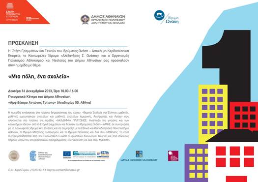 ΜÝσα σε Ýνα σýγχρονο οικιστικü περιβÜλλον εξελßσσεται μια ιστορßα χιλιÜδων ετþν. Τα σýγχρονα κτßρια, τα διαχρονικÜ μνημεßα, τα πÜρκα, οι δρüμοι, οι πλατεßες, τα σοκÜκια διηγοýνται σε μικροýς και μεγÜλους την ιστορßα τους και τους οδηγοýν σε νÝα μονοπÜτια σκÝψης, δημιουργßας και προβληματισμοý. Στον ιστü της πüλης υπÜρχουν τα περισσüτερα μουσεßα, πολιτιστικÜ κÝντρα και χþροι δημιουργßας και Ýκφρασης. Το καθÝνα απü αυτÜ Ýχει μια ζωντανÞ παρουσßα και παρÝχει στους επισκÝπτες εξαιρετικÝς ευκαιρßες και δυνατüτητες μÜθησης και αναψυχÞς. Σκοπüς της ημερßδας εßναι να αναδεßξει τον τρüπο με τον οποßο μια πüλη γßνεται Ýνα ανοικτü σχολεßο για üλους και τη συμβολÞ του πολιτισμοý, των γραμμÜτων και των τεχνþν στην εκπαßδευση, εßτε πρüκειται για μαθητÝς, εßτε για φοιτητÝς, εßτε για ενÞλικες ¸λληνες και ξÝνους, εßτε για τις ομÜδες ατüμων με ξεχωριστÝς ικανüτητες. Στüχος της ημερßδας εßναι να αναδειχθοýν οι καλÝς πρακτικÝς των φορÝων του πολιτισμοý που δραστηριοποιοýνται σε εκπαιδευτικÜ προγρÜμματα και η μεταφορÜ της εμπειρßας των ατüμων της εκπαιδευτικÞς κοινüτητας, προκειμÝνου να παραχθοýν νÝες προτÜσεις που θα ενισχýσουν τις συνεργασßες των χþρων του πολιτισμοý μεταξý τους και θα διευρýνουν τη συμμετοχικüτητα των εκπαιδευομÝνων. Μεταξý των ομιλητþν διακρßνονται η ΓενικÞ ΓραμματÝας του Υπουργεßου Πολιτισμοý και Αθλητισμοý, κυρßα Λßνα Μενδþνη, οι υπεýθυνοι των μεγÜλων μουσεßων και πολιτιστικþν χþρων της ΑθÞνας, επιστÞμονες και εμπειρογνþμονες που ασχολοýνται με τις ειδικÝς ομÜδες και κατηγορßες του πληθυσμοý. Η ημερßδα εντÜσσεται στο πλαßσιο δημοσιüτητας των δρÜσεων: «ΘερινÜ Σχολεßα για ¸λληνες μαθητÝς, μαθητÝς ευρωπαúκþν σχολεßων και μαθητÝς σχολεßων ΑμερικÞς, Αυστραλßας και Ασßας» που υλοποιÞθηκαν το 2012 και το 2013 στο πλαßσιο της πρÜξης «ΑΚΑΔΗΜΙΑ ΠΛΑΤΩΝΟΣ: ΑνÜπτυξη της γνþσης και των καινοτüμων ιδεþν» απü τη ΣτÝγη ΓραμμÜτων και Τεχνþν του Ιδρýματος ΩνÜση – ΑΜΚΕ, σε συνεργασßα με το ΚοινωφελÝς ßδρυμα Α.Σ. ΩνÜσης και σε σýμπραξη με το Εθνικü και Καποδιστριακü ΠανεπιστÞμιο Αθηνþν και το ºδρυμα Μεßζονος Ελληνισμοý. Το Ýργο συγχρηματοδοτεßται απü την ΕυρωπαúκÞ ¸νωση (Ευρωπαúκü Κοινωνικü Ταμεßο) και απü εθνικοýς πüρους μÝσω του επιχειρησιακοý προγρÜμματος «Εκπαßδευση και Δια Βßου ΜÜθηση». Με αφορμÞ το συμβολισμü της Ακαδημßας ΠλÜτωνος, η οποßα Þταν Ýνα ολοκληρωμÝνο πνευματικü κÝντρο της αρχαßας ΑθÞνας και μßα απü τις παλαιüτερες γειτονιÝς της σημερινÞς ΑθÞνας, ¸λληνες και ξÝνοι μαθητÝς συμμετÝχουν σε Ýνα πολýπλευρο πρüγραμμα βιωματικÞς μÜθησης με θεματικü πυρÞνα τον ελληνικü πολιτισμü στη διαχρονßα του. Στους δýο κýκλους φιλοξενßας των Θερινþν Σχολεßων, που πραγματοποιÞθηκαν τον Ιοýλιο 2013, συμμετεßχαν εβδομÞντα μαθητÝς του Γενικοý Λυκεßου Ροδολßβους απü τις ΣÝρρες, του Stedelijk Gymnasium Leiden απü το ΛÝιντεν της Ολλανδßας, του National High School for Ancient Languages and Cultures “St. Constantine Cyril the Philosopher” απü τη Σüφια της Βουλγαρßας, του Institut du Sacré-Coeur απü τη Μονς του Βελγßου και της Frederick Douglass Academy απü τη ΝÝα Υüρκη των ΗΠΑ. Οι ¸λληνες και ξÝνοι μαθητÝς παρακολοýθησαν μια ποικιλßα απü ενδιαφÝροντα θÝματα και ασχολÞθηκαν εποικοδομητικÜ με τα διαφορετικÜ γνωστικÜ αντικεßμενα στο ευρýτερο πνεýμα της «Ακαδημßας ΠλÜτωνος». Συγχρüνως εßχαν την ευκαιρßα να γνωρßσουν τη σýγχρονη ΕλλÜδα και τους ανθρþπους της. ΜÝσα απü τις πλοýσιες δραστηριüτητες βßωσαν τη γνþση, μÝσ