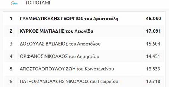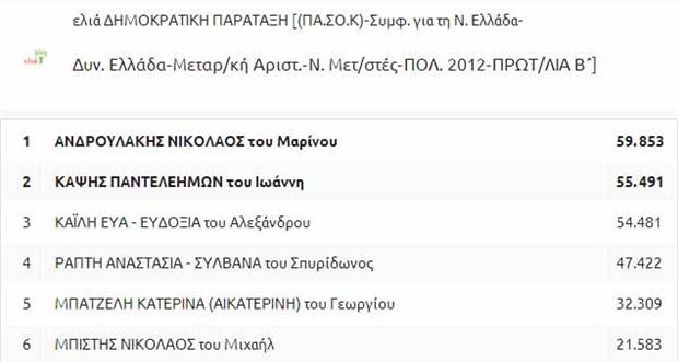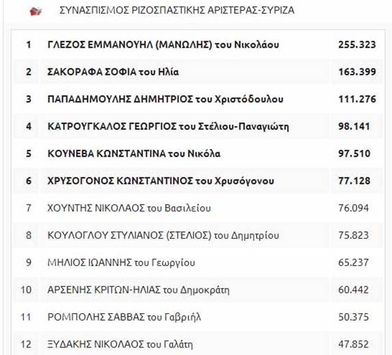 ΣΥΡΙΖΑ (6) και εκλÝγονται: Ο Μανþλης ΓλÝζος, η Σοφßα ΣακορÜφα, ο ΔημÞτρης Παπαδημοýλης, ο Γιþργος Κατροýγκαλος, η Κωνσταντßνα Κοýνεβα, και ο Κþστας Χρυσüγονος.