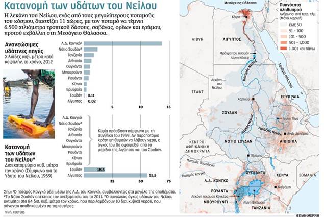 ΔιατροφικÞ κρßση Ειδικοß της διαχεßρισης των υδÜτων επισημαßνουν üτι η διατροφικÞ ασφÜλεια üλου του πλανÞτη απειλεßται απü την Ýλλειψη νεροý, üπως αυτÞ που προκαλεßται απü τα μεγÜλα αρδευτικÜ Ýργα στον Ανω Νεßλο, την κλιματικÞ αλλαγÞ και την πληθυσμιακÞ αýξηση. «Η Αßγυπτος εßναι εξαρτημÝνη απü τον Νεßλο για κÜθε της ανÜγκη σε νερü. Τα νερÜ του Νεßλου μοιρÜζονται, üμως, σε 11 κρÜτη», λÝει ο ΜπενεντÝτο ΜπρÜγκα, πρüεδρος του διεθνοýς οργανισμοý World Water Council. ΠαρÜ την αυστηρÞ στÜση που εßχε υιοθετÞσει ο Ýκπτωτος πρüεδρος Μüρσι για το θÝμα της κατανομÞς των υδÜτων του Νεßλου, ο νÝος πρüεδρος Σßσι σχεδιÜζει να επισκεφθεß την πρωτεýουσα της Αιθιοπßας Αντις ΑμπÝμπα μÝσα στο καλοκαßρι, για να Ýχει επαφÝς γýρω απü το θÝμα του Νεßλου και των υδÜτων του.