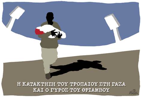 ΜÝσα σε Ýνα στÜδιο, Ýνας Üντρας κρατÜ Ýνα λαβωμÝνο μωρü στα χÝρια, ενþ η λεζÜντα γρÜφει «Η κατÜκτηση του τροπαßου στη ΓÜζα και ο γýρος του θριÜμβου». Για üσους δεν τον γνωρßζουν εßναι αυτüς που πÝρσι τον εßχαν καταγγεßλει κÜποιοι «επαναστατημÝνοι» αριστεροß ως σεξιστÞ, υπüδουλο των αφεντικþν και üτι «κουνÜει κουδουνßστρες για να γελÜνε οι βασιλιÜδες και οι αυλικοß». Για του λüγου το αληθÝς σας παραπÝμπω στο Üρθρο της ΑΥΓΗΣ με ημερομηνßα 13-11-2013 που εßναι δημοσιευμÝνο ΕΔΩ. ΣÞμερα τι Ýχετε να πεßτε σýντροφοι. ΤουλÜχιστον ζητÞστε του και καμιÜ συγγνþμη, δεν κÜνει κακü.
