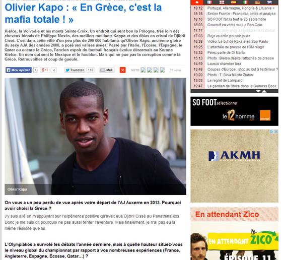Καταγγελßες που σοκÜρουν για την πραγματικüτητα στο ελληνικü ποδüσφαιρο Ýκανε ο ΟλιβιÝ Καπü σε συνÝντευξη που δημοσιεýεται στη γαλλικÞ ιστοσελßδα sofoot.com., ισχυριζüμενος μεταξý Üλλων üτι υπÜρχει κýκλωμα που ελÝγχει τα πÜντα, ενþ αναρωτÞθηκε γιατß οι διεθνεßς ομοσπονδßες δεν κÜνουν τßποτα και προÝτρεψε τους ξÝνους παßκτες να αποφεýγουν τη χþρα μας.